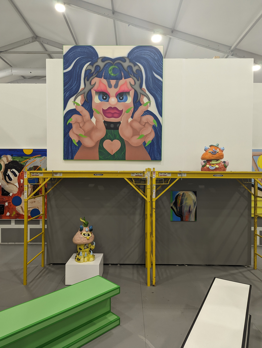 Highlights included a massive booth by Spanish gallery L21, which was dominated by a painting from Mallorcan artist Fátima de Juan Carlos. It depicts a witchy woman with a fierce-looking neon green manicure, who seemed to be casting a spell over an installation of ceramics by Mira Makai and I-beam benches by Richard Woods.