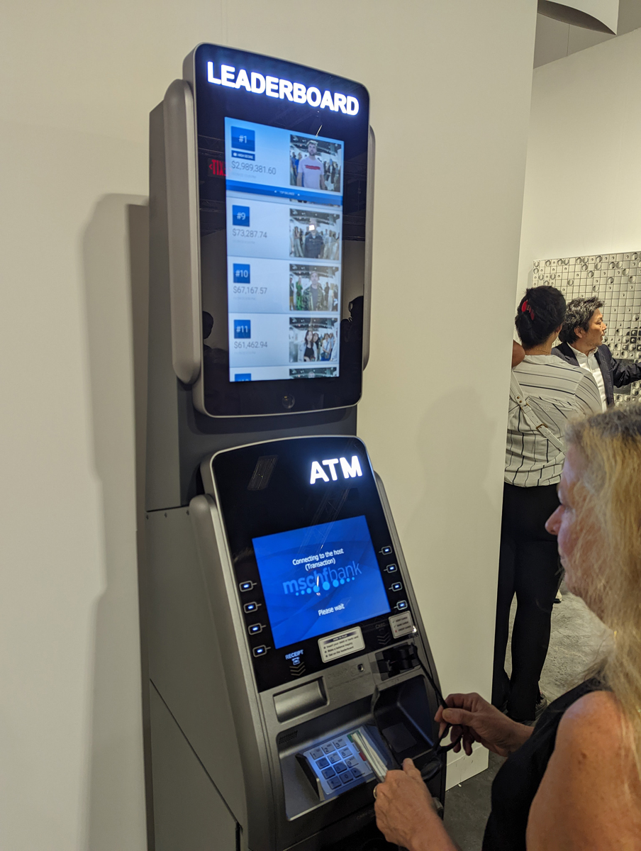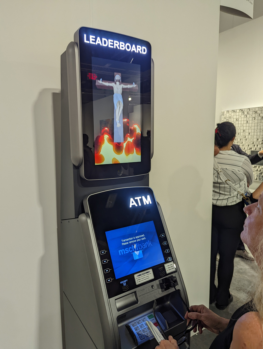 At Perrotin’s booth, MSCHF had an ATM that recorded and ranked the checking account balances of users. When we swung by the opening, the #1 spot was dominated by a guy in a pink t-shirt with under $3 million in his account. I suspected the “seriously” wealthy weren’t participating (the 1% tend to value discretion, as the CHF’s enduring stability suggests, after all). But maybe the nouveau riche are up for a bit more fun? Music producer Diplo (who many a Bmore artist might hazily-remember partying with back in the heyday of the warehouse scene) later claimed and held on to the top spot until being supplanted in the 11th hour.