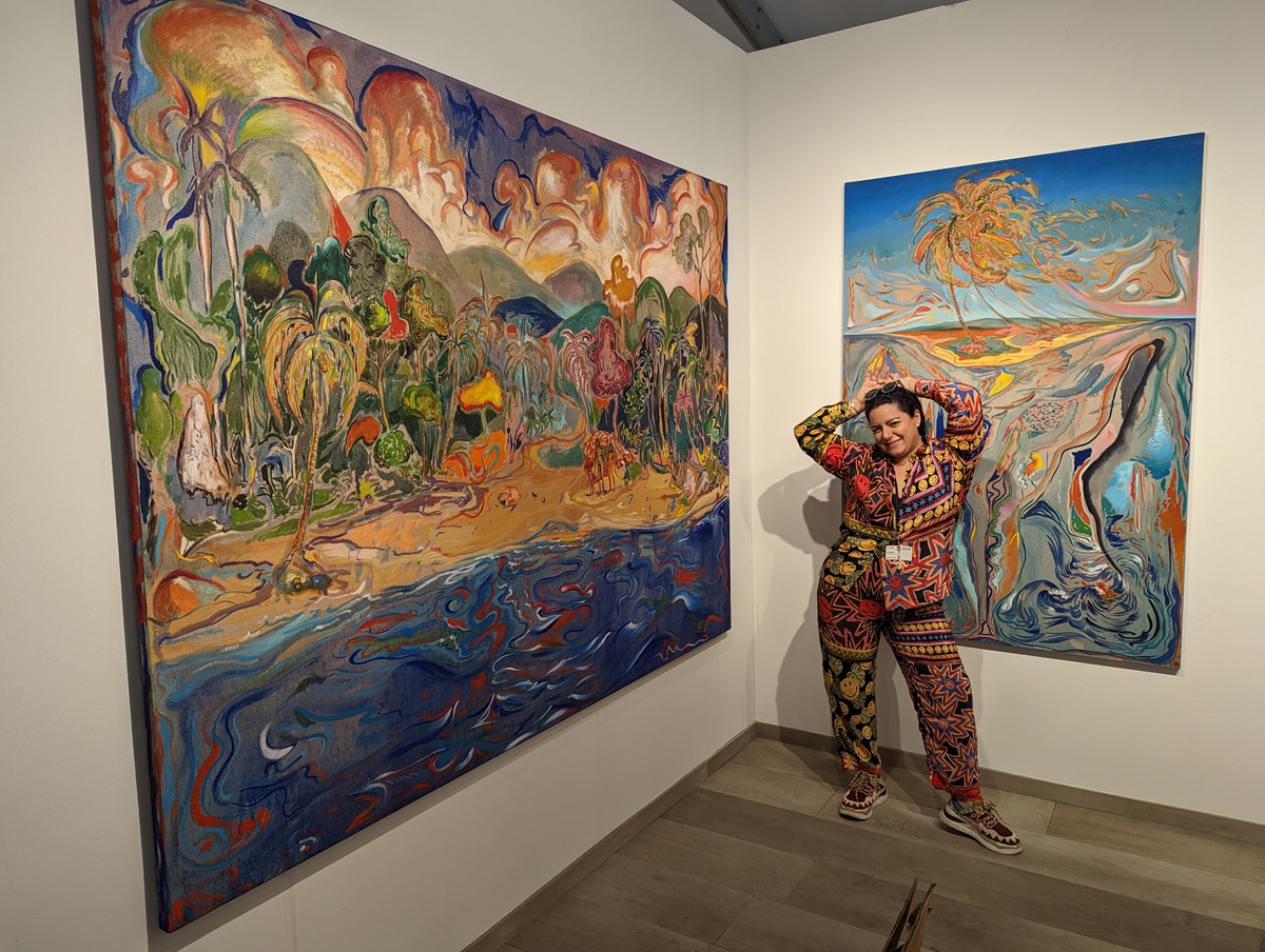 Katia Rosenthal poses with paintings by Alejandro Piñeiro Bello in her booth at NADA