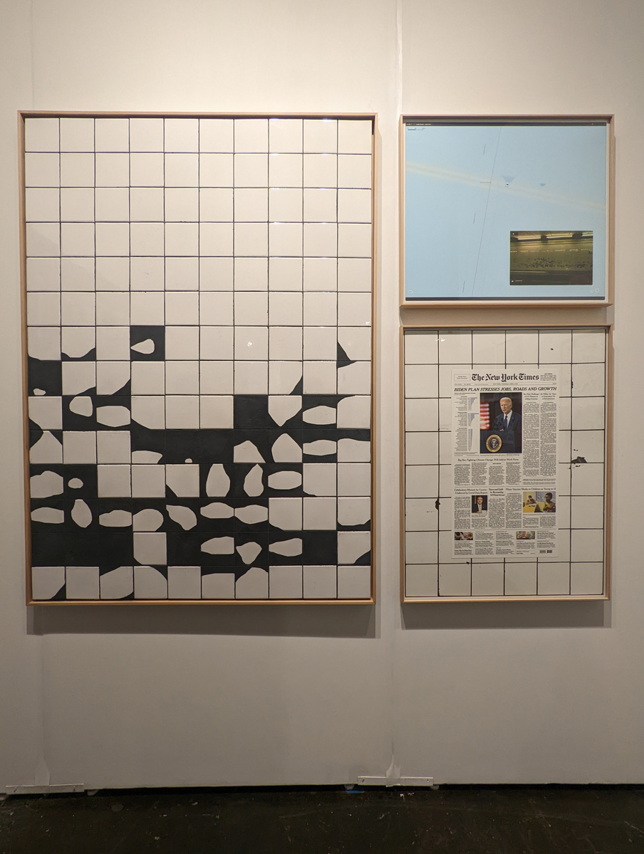 Pablo Gómez Uribe at PROXYCO Gallery's NADA booth. Uribe juxtaposes articles about the Biden administration's funding for highways and private electric cars with recreations of dilapidated New York Subway stations.