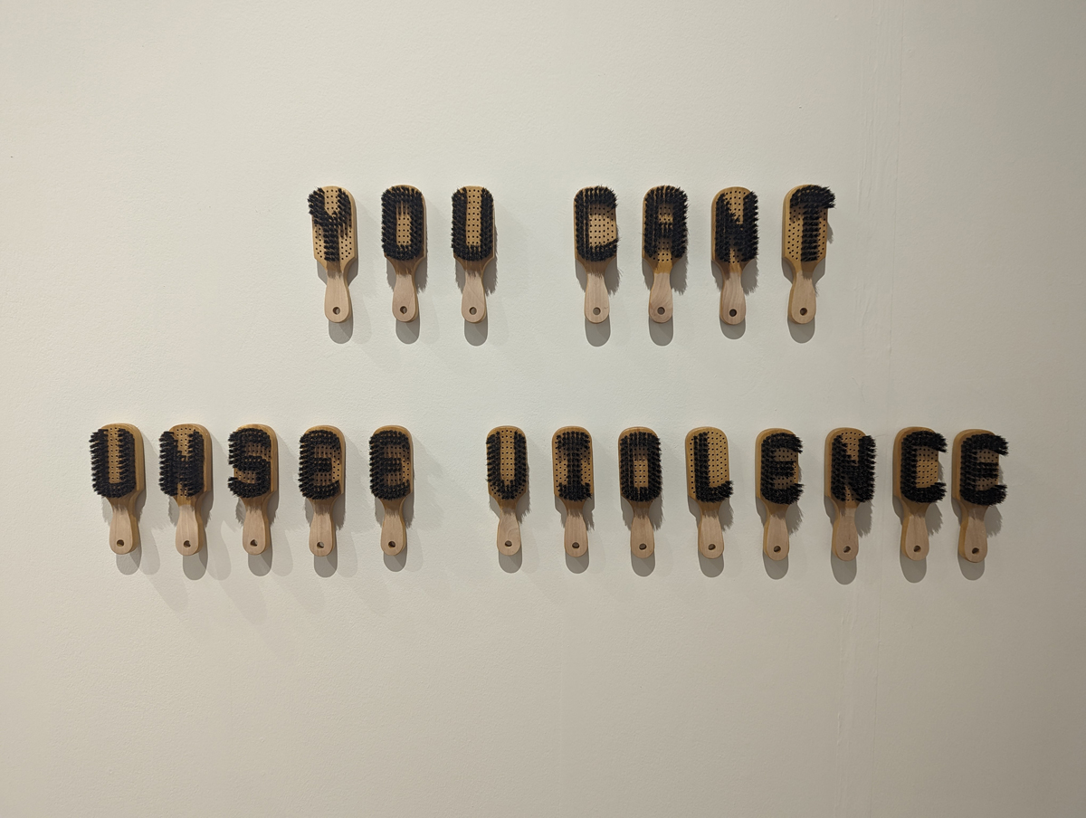 Galerie Myrtis had by far the strongest booth at CONTEXT, showing Tawny Chatmon, Morel Doucet, Monica Ikegwu, Megan Lewis, Delita Martin, and Felandus Thames. The latter’s assemblage of hair brushes spelling out “YOU CAN’T UNSEE VIOLENCE” spoke to generational trauma and beauty rituals through a loaded use of unconventional materials.