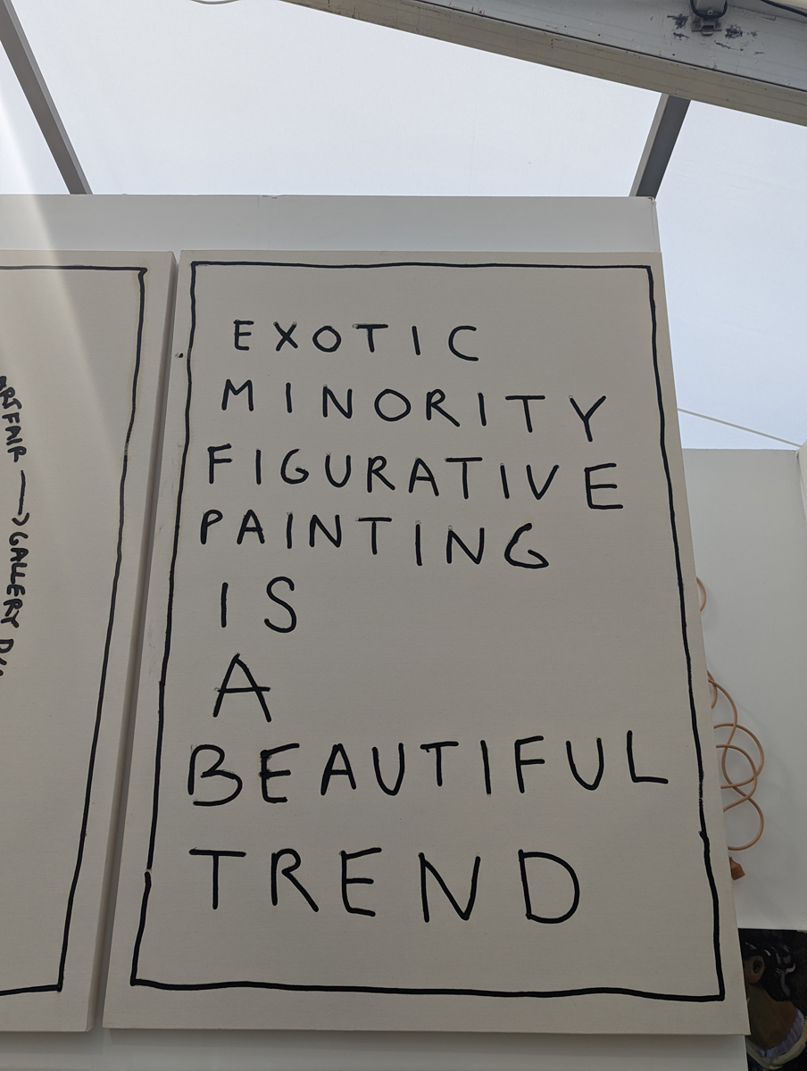 Just one of Juan Uribe's many stinging-because-they're true text-based paintings at Bogotá-based SGR Galería's booth at UNTITLED