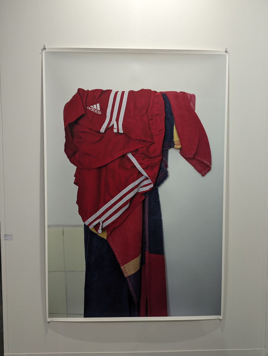 But pants aren’t just an #aesthetic preference: some artists have been employing them to conceptual ends from the serious to the playful. Hank Willis Thomas at Jack Shainman, for example, sewed prison uniforms together to form a flag-like vortex evoking a swastika, alluding to the endless cycle of incarcerated labor. Meanwhile, Jonathas de Andrade’s charming installation in the “Meridians” section of the fair comprised sculptures the artist made to fit swim trunks salvaged from changing rooms’ lost-and-found boxes in his native Brazil.