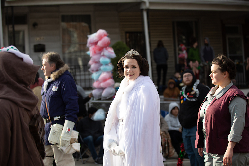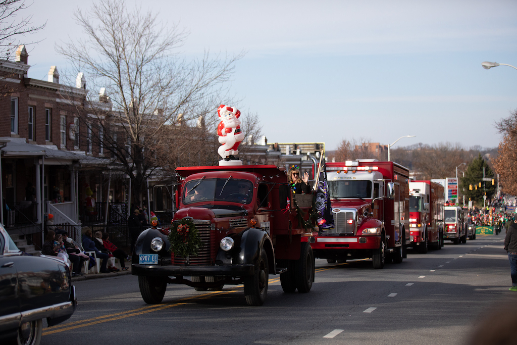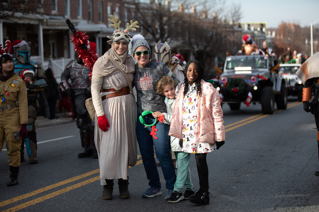 The 49th Annual Baltimore Mayor’s Christmas Parade was held on Sunday, December 4, 2022 at 1 pm. The event is always sponsored by community associations and businesses in North Baltimore’s Hampden and Medfield neighborhoods and run by dedicated volunteers. This year, it included about 160 marching units and featured floats, local politicians, media personalities, over 100 Harley Davidson motorcycles, a steam calliope, marching bands, Mummers of Philadelphia, Miss Yuletide and Jr. Miss Yuletide, what appears to be the entire cast of Star Wars, Baltimore’s Mayor, and Santa Claus. The parade winds down Falls Road and onto The Avenue (36th Street) in Hampden along a 2.5 mile route and attracts up to 25,000 in crowds.