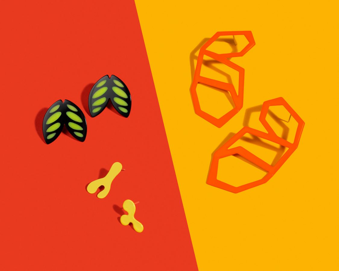 Jen Moore is a metalsmith and educator. She is currently an Exhibition Director, Studio and Program Manager at the Baltimore Jewelry Center. She received her MFA in Jewelry and Metals from San Diego State University and a BA in Art History from UC Berkeley. She has exhibited both nationally and internationally and has been published in Metalsmith Magazine. Of this line of production work, Moor says, “I wanted to explore jewelry that spoke to the wearer about the nostalgia of county fairs and school party decorations. I wanted earrings that capture the delight of bright metallic paper cutouts of youth, and brooches that remind the wearer of hot summer nights out late watching rock concerts.”