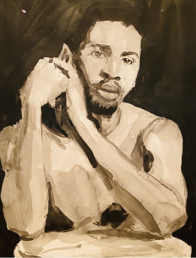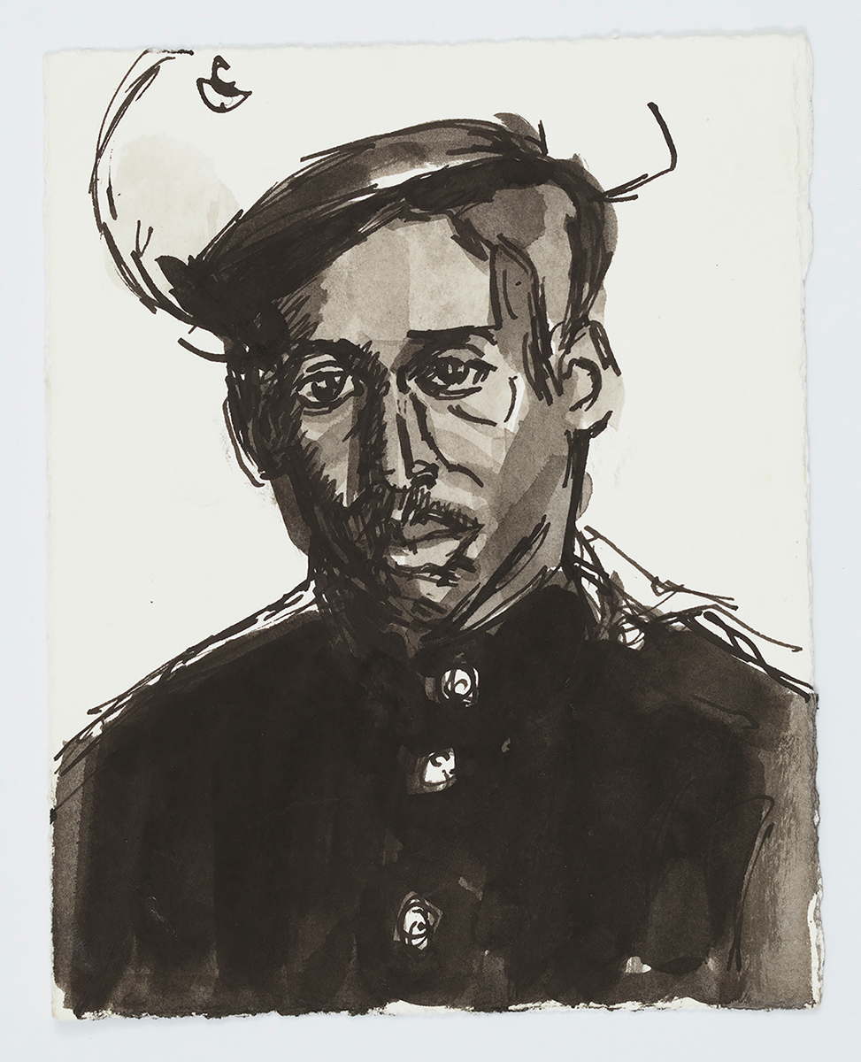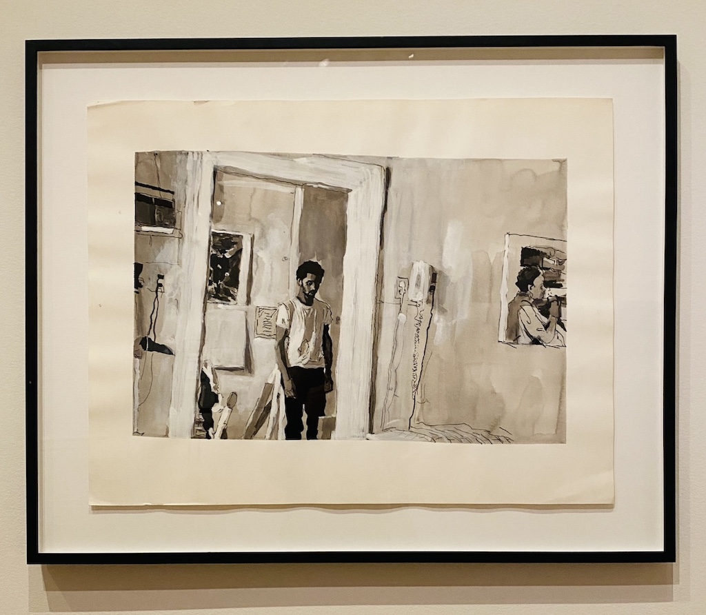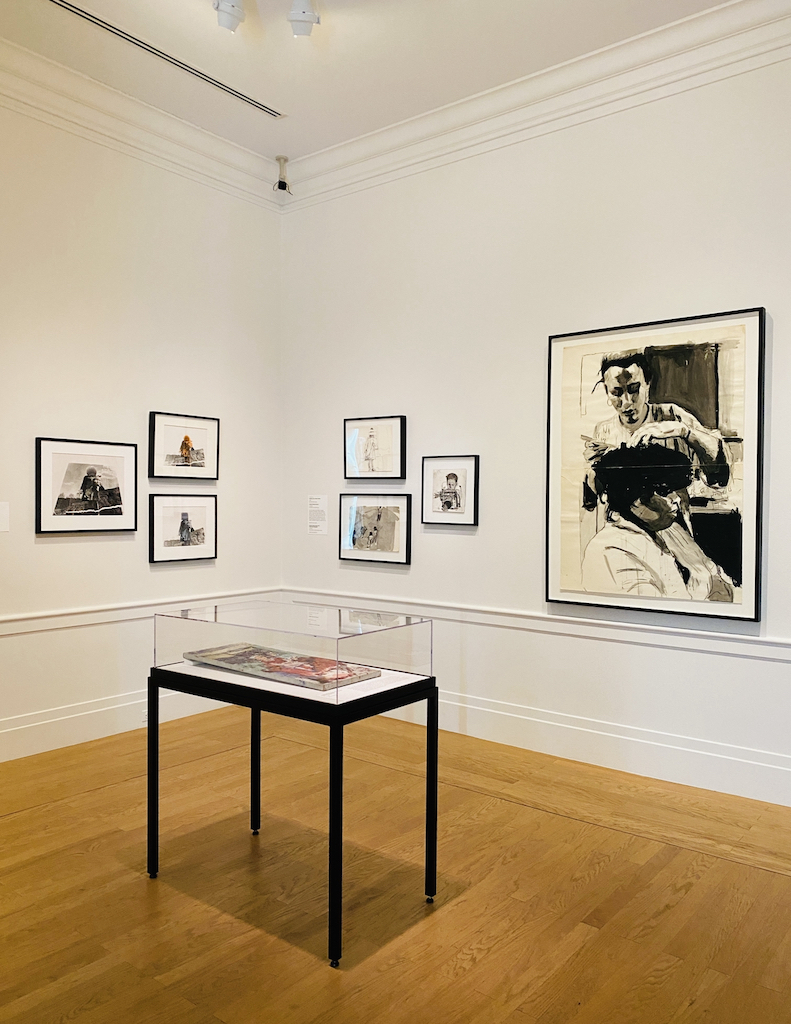 For example, in “Untitled (Children Playing After Thomas Ellis Photograph),” c. 1981-1985, Ellis translated one of his father’s photographs into an illustration, interrogating the medium of photography with his loose graphite lines and thick strokes of black ink. The image depicts a small group of kids playing hopscotch on a warm day.