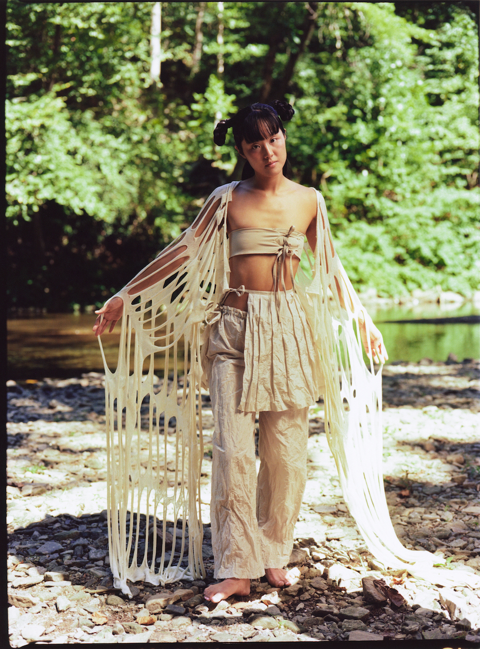 A four-character idiom meaning natural, immaculate beauty, Chun-yee-mu-bong literally translates as “No seam is found in seonnyeo’s clothing.” Seonnyeo is a Korean word for a celestial woman (or a group of them) that appears across East Asian myths as a symbol of beauty and virtue. In Korean folktales, this fairylike character descends to the human world to bathe in mountain springs. The visit of seonnyeo is the theme of the latest collection 날개 nalgae (“wing” in Korean) by Bokeum Jeon, a multidisciplinary artist, MICA graduate, and designer now based in Philadelphia.