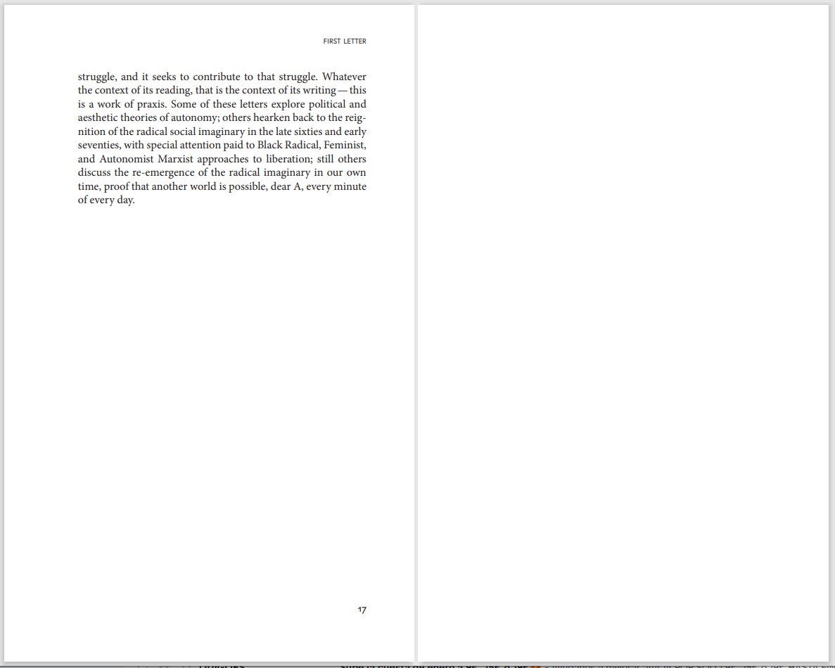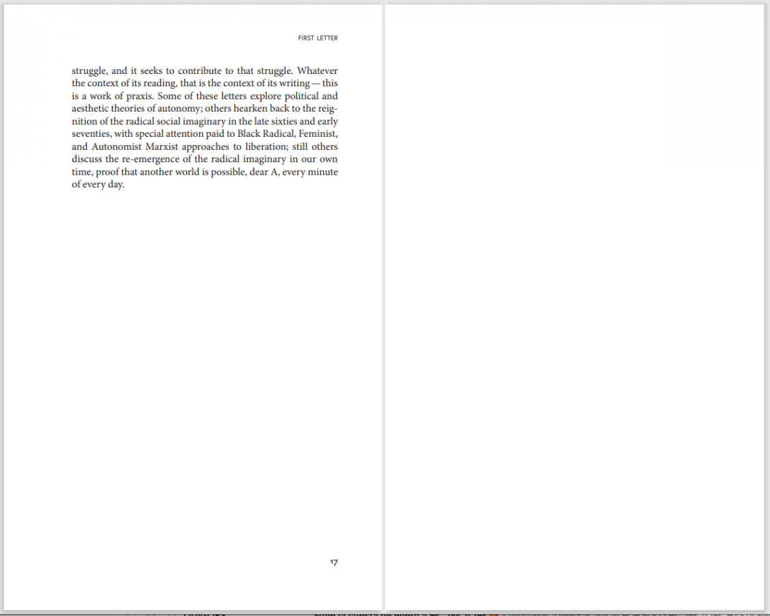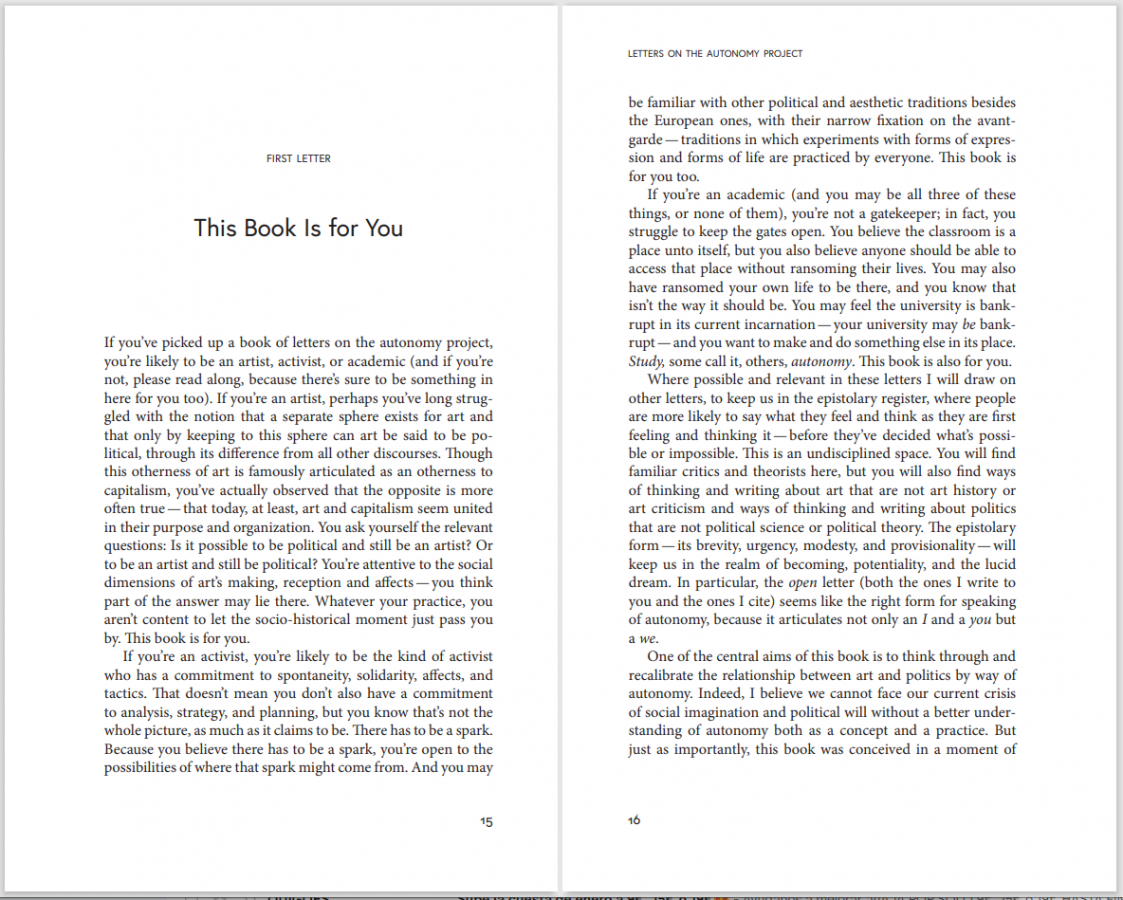 You know the book is a series of letters, and I like to refer to correspondences that I found interesting and that correspondence, that historical moment between Adorno and Marcuse, is really instructive for us. I teach at Cal Arts and the kind of founding pedagogy of CalArts was again very predicated on the notion that art does something different in the classroom by attending to the social, and I would say the political, dimensions because that’s really what you’re after. At CalArts, you were considered an artist from the moment you arrived. It wasn’t an apprenticeship, you didn’t have to worry about acquiring skills in quite the same way that you need to in other kinds of academic arts environments. It was looked at as faculty collaborating with students, and that faculty were just artists with more experience.