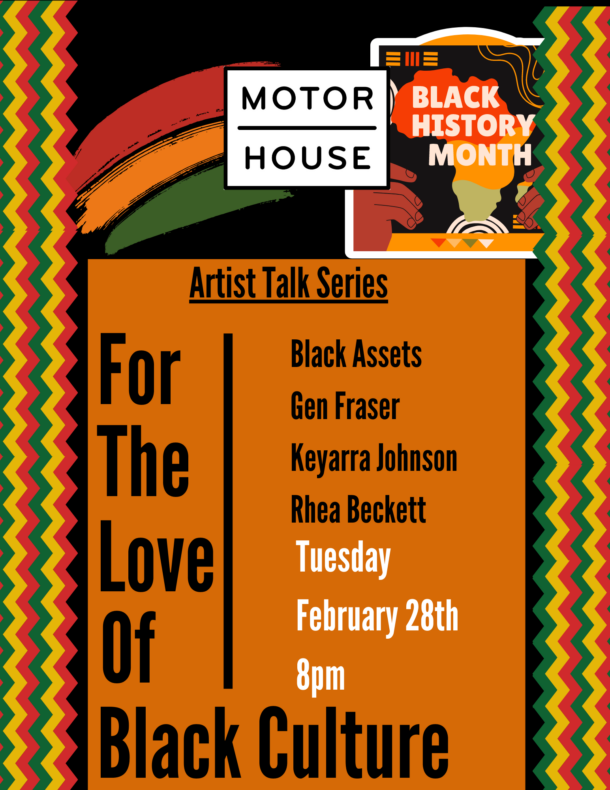 Often, when discussions of artistic voices in Black Culture occur, we tend to immediately consider the biggest names from yesterday and today. Kehinde Wiley,, Basquiat, Larry “Poncho” Brown and many more are artists who have had a great impact on Black culture. In addition to famous names like theirs, there are others who are fighting to be heard. They, too, have a story full of merit and fresh perspectives. Motor House is proud to offer four Black creatives the platform to publicly discuss their art and all things Black at “For The Love Of Black Culture” on February 28th at 8 pm. Everything (even the most controversial) will be up for discussion with the aim to: educate, inform, debate, and evolve our understanding of Black Culture.