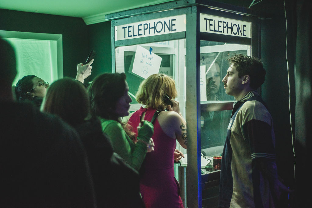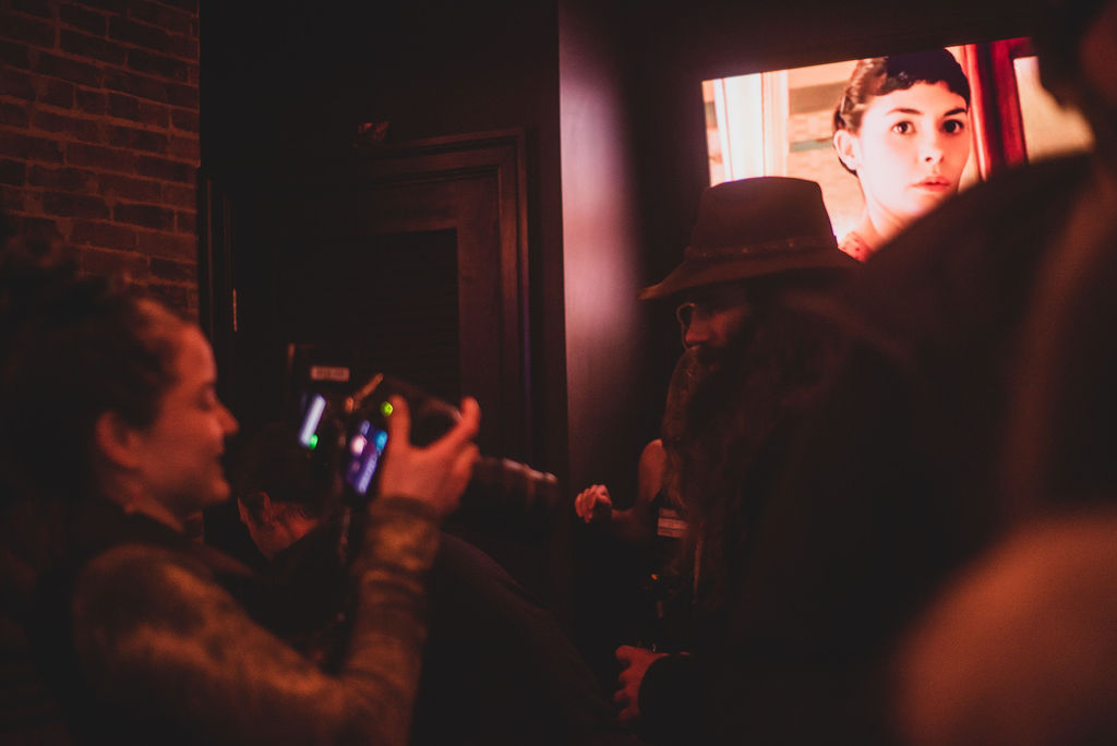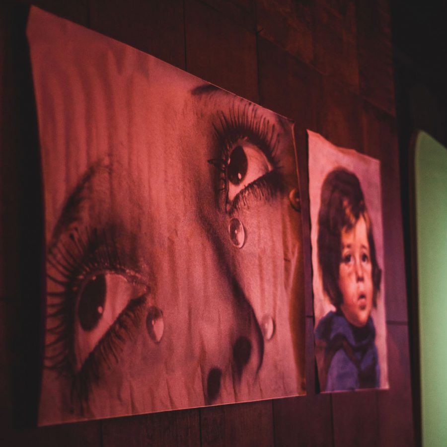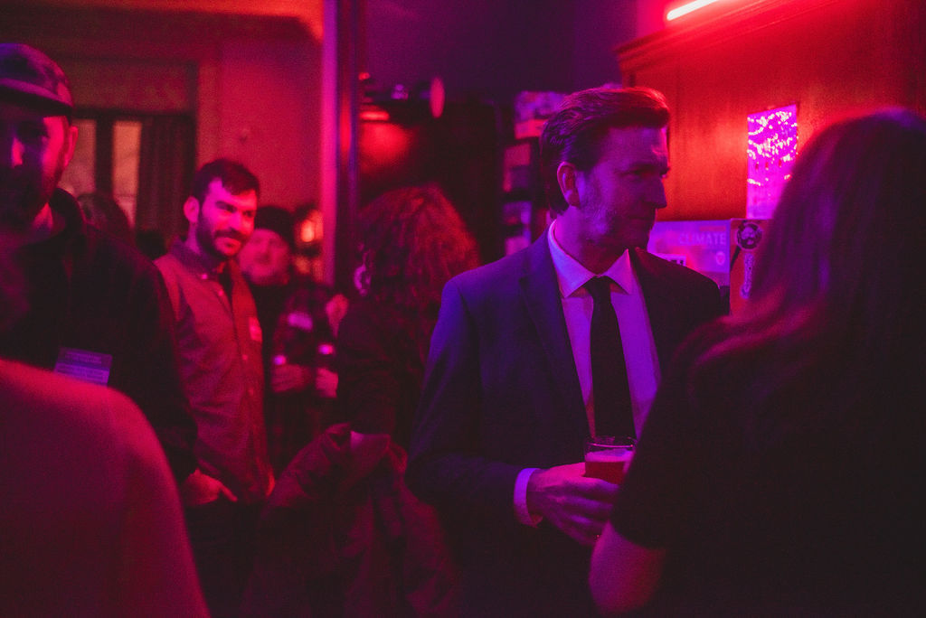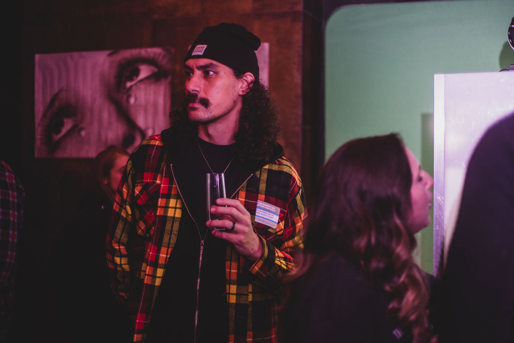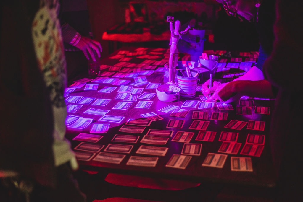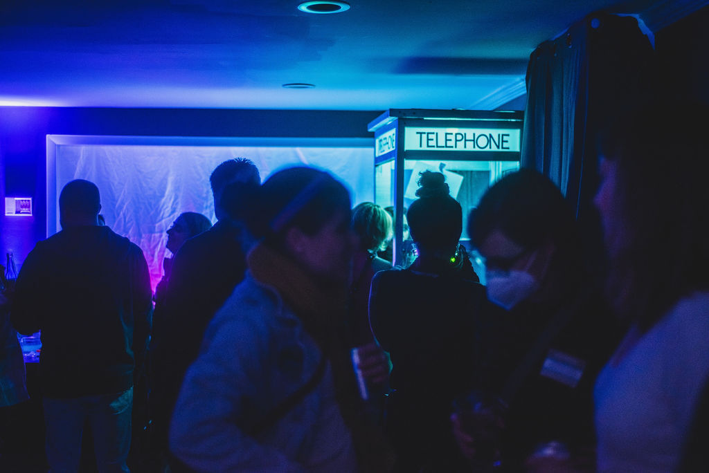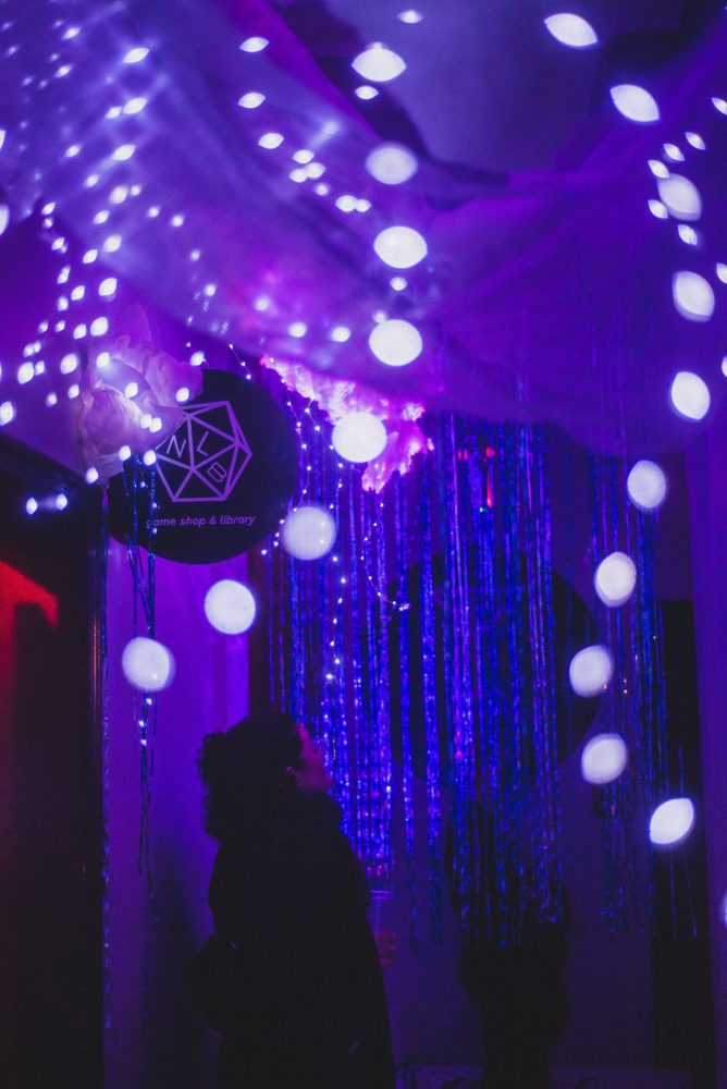As soon as I stepped into the foyer of the Saddest Day of the Year party, I understood that Ana Tantaros had built a whole world for her event. Blue twinkle lights hung from puffy cotton clouds along the ceiling to look like rain. Darkened hallways gave way to rooms full of people and warm pink and red lighting. Everyone wore a name tag labeled with a dark humor phrase from “I lie to my therapist” to “AI is taking over” or “What even is my comfort zone?”