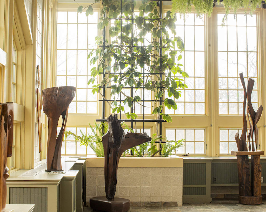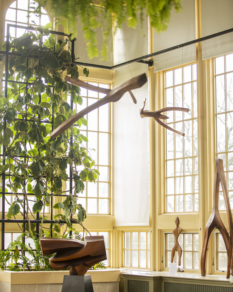 This thinking was central in planning Dancing With Trees, the first major posthumous retrospective for wood sculptor and painter Joe Haviland (1952-2020), a Baltimore presence for many decades. Hosted at the Howard Peters Rawlings Conservatory & Botanic Gardens in Baltimore, this exhibit has been an opportunity for the public to engage with Haviland’s rich oeuvre, where wooden carvings mimic the natural forms that inspired them and abstract paintings forge a connection between nature, human figure, and a vision where a life force is present consistently in all forms.
