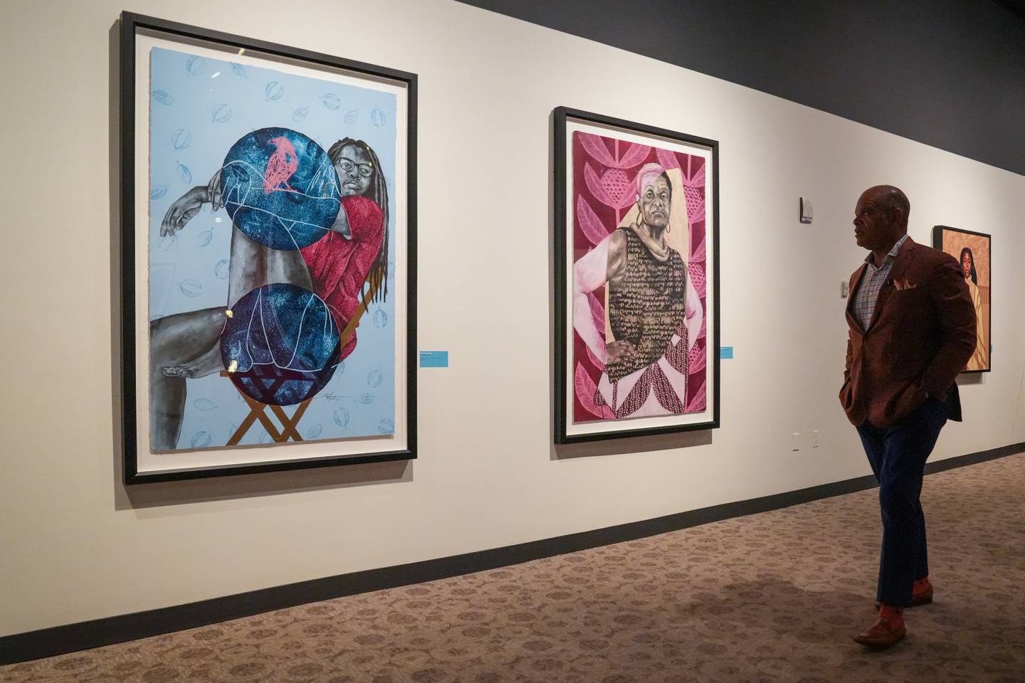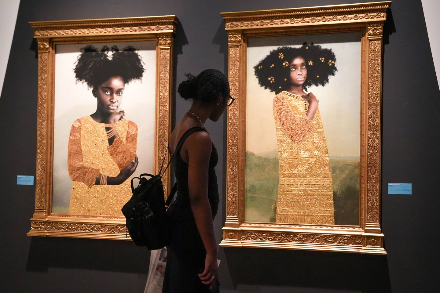 Header Image: Monica Ikegwu, a Baltimore-based portrait artist, examines Tawny Chatmon’s work. Images from left to right: Ralisha in Pastiglia and Monique in Pastiglia from “The Pastoral Scenes” by Tawny Chatmon, Courtesy of the artist and Galerie Myrtis. (Ulysses Muñoz/The Baltimore Banner)