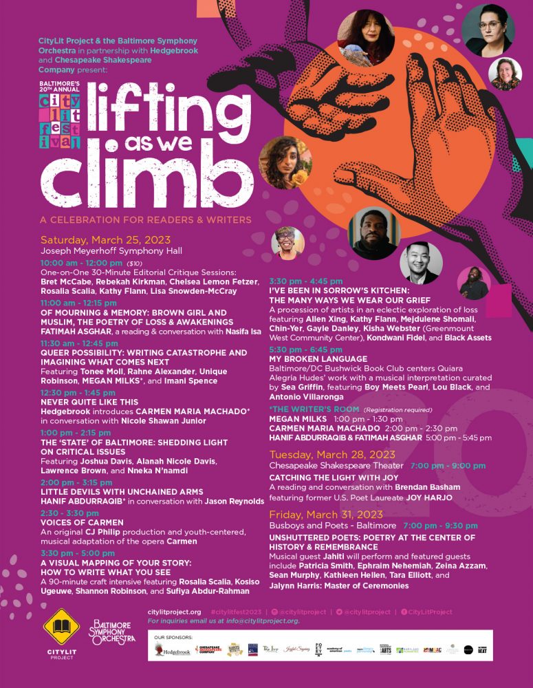 CityLit Project in partnership with the Baltimore Symphony Orchestra presents the CityLit Festival, a live and in-person, three-day event featuring a stellar lineup of national, regional, and local literary talent. This spring marks the 20th year of the free, signature event with Lifting As We Climb, as the festival theme, championing the small, literary nonprofit that is working to serve while trying to build. The daylong celebration on Saturday, March 25 at the Joseph Meyerhoff Symphony Hall on 1212 Cathedral Street from 10:00 am – 7:00 pm, features poet, cultural critic, and winner of the Andrew Carnegie Medal for Little Devil in America, Hanif Abdurraqib, poet, co-creator, and writer for the Emmy-nominated web series ‘Brown Girls’ Fatimah Asghar (If They Come For Us), Lambda Literary Finalist for Transgender Fiction Megan Milks (Margaret and the Mystery of the Missing Body), and a new partnership with Hedgebrook, a premier residency for women writers introduces acclaimed author Carmen Maria Machado (In the Dream House).
