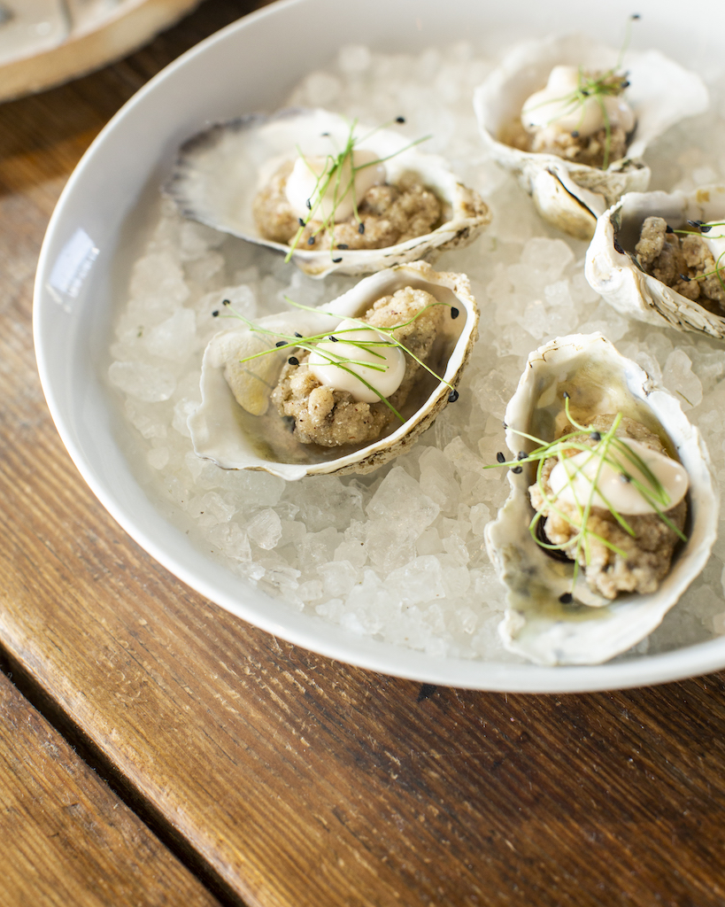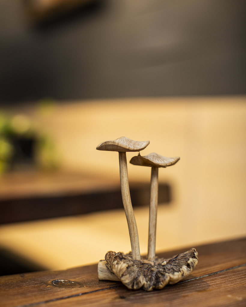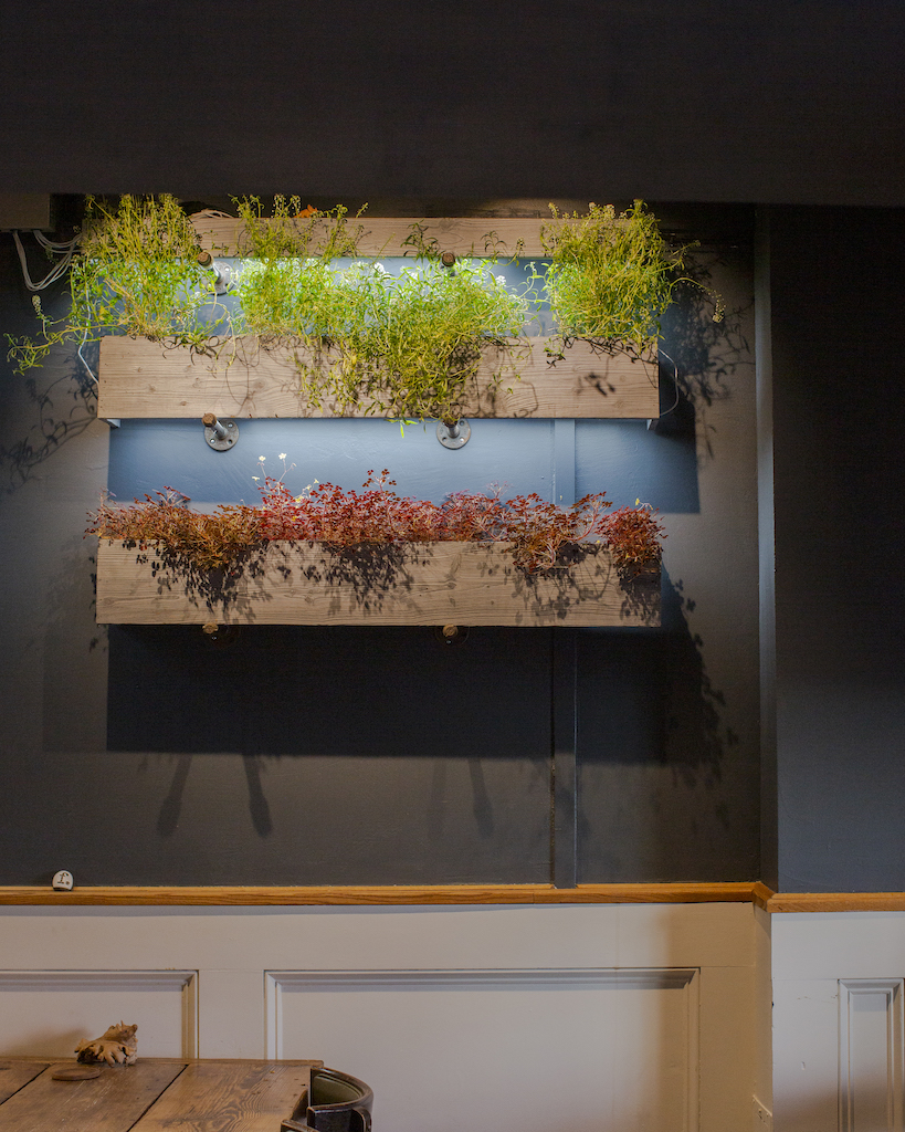 “Maryland really captivated me. You could be an hour into the mountains and [within] a couple of hours be at the beach and everything in between,” Chef Chris shares. His soft, deep voice carries fully through the empty dining room with the strength of a long drawn bow pulling across a cello. The dining room feels like a greenhouse—boxes of live greens punctuate the walls, illuminated in the artificial glow of warm bulbs mimicking sunlight. The heavy wood tables and hand-carved mushroom sculptures create a feeling of being surrounded by the canopy of the forest, a place Chris has spent endless hours over the past twenty years.