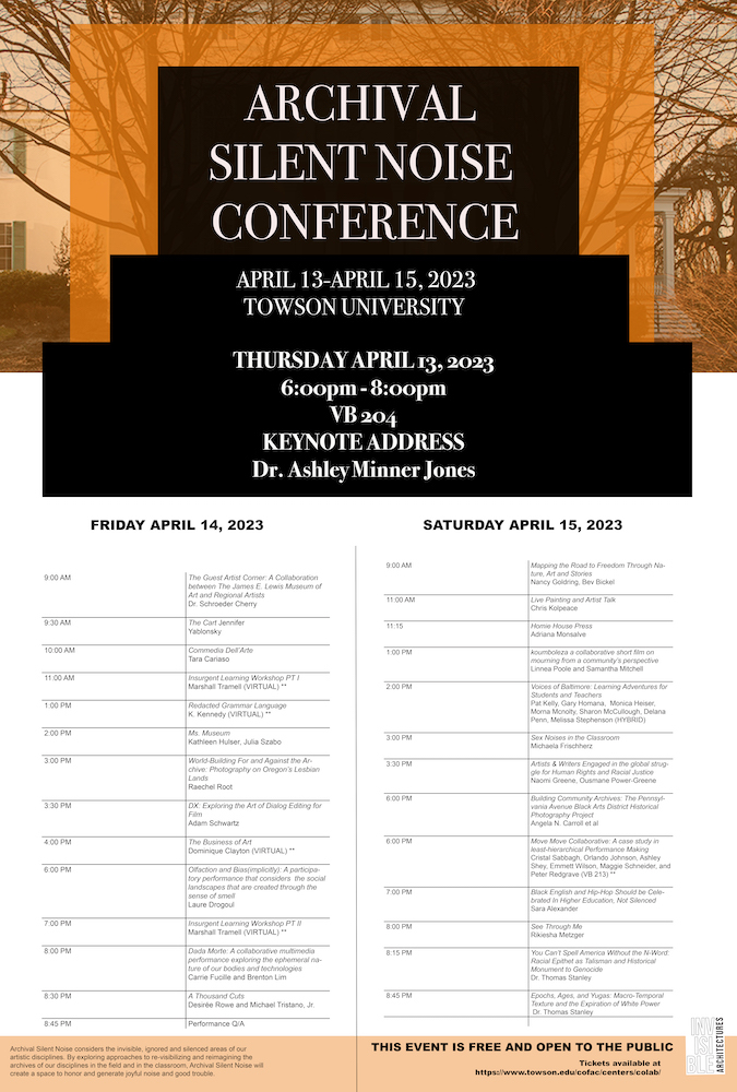 Archival Silent Noise considers the invisible, ignored and silenced areas of our artistic disciplines. By exploring approaches to re-visibilizing and reimagining the archives of our disciplines in the field and in the classroom, Archival Silent Noise will create a space to honor and generate joyful noise and good trouble.