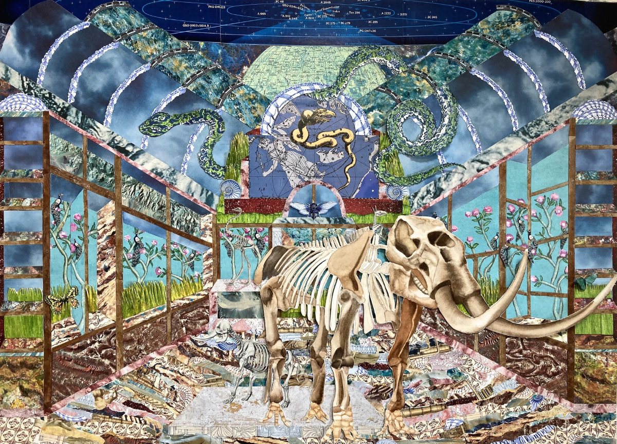 In a steampunk way. It’s funny. With the mastodon, it was a chinoiserie. The chinoiserie could either represent a Trompe l’oeil. Like, you can’t go outside. And so this piece is reminding you, covering up the windows, it’s not safe to go out because it’s too toxic. Or it could be that the windows are open, and it’s so beautiful outside with this idealized landscape.