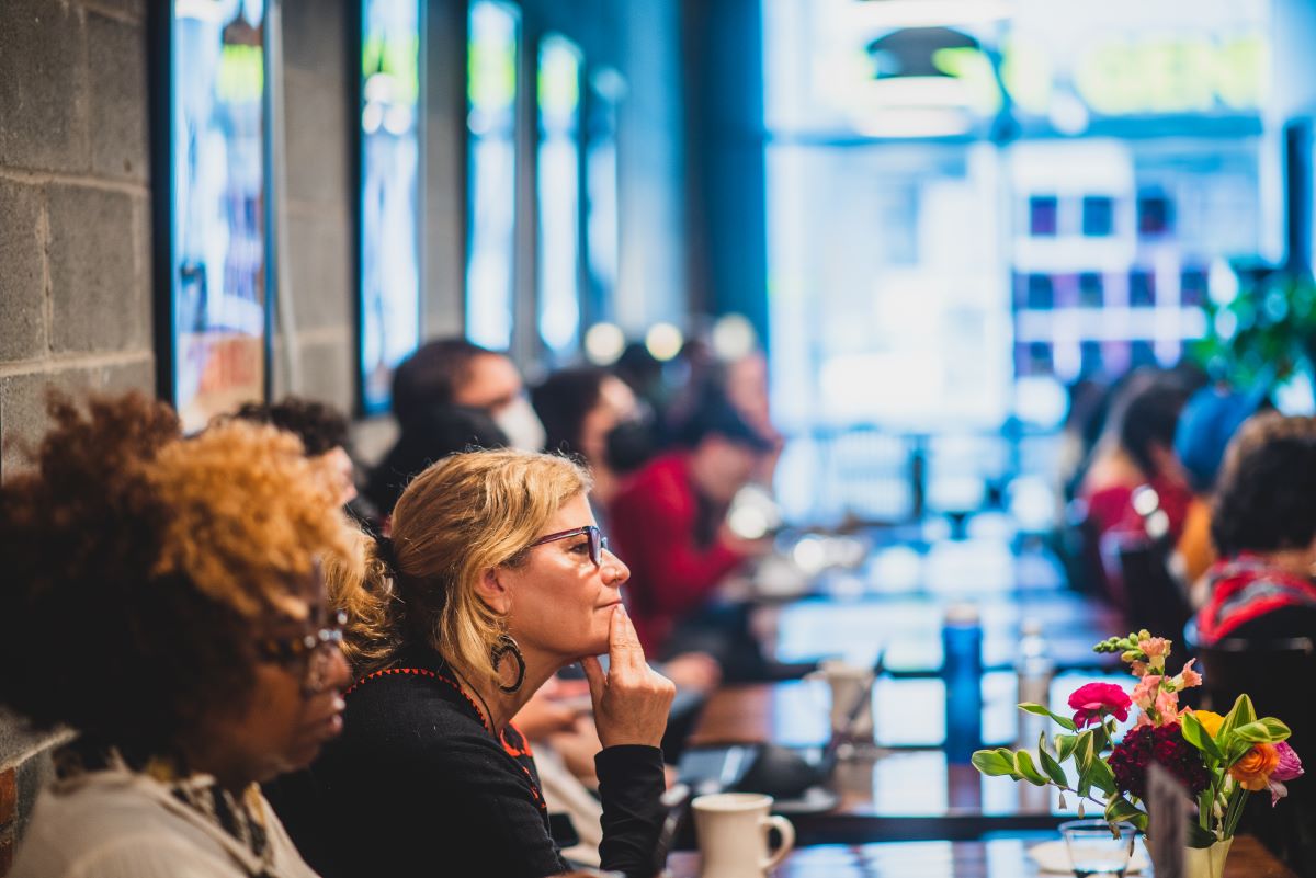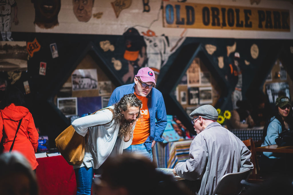 The audience settled under the collection of historic Baltimore baseball teams’ pennants arranged on the walls (the brewery was the site of Terrapin Park in the first half of the 20th century), sipping beer out of clear plastic cups, and chatting with each other while they waited for the salon to begin. At one point, Odyssey’s “Our Lives Are Shaped by What We Love” came on the speakers.