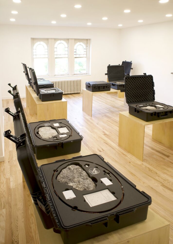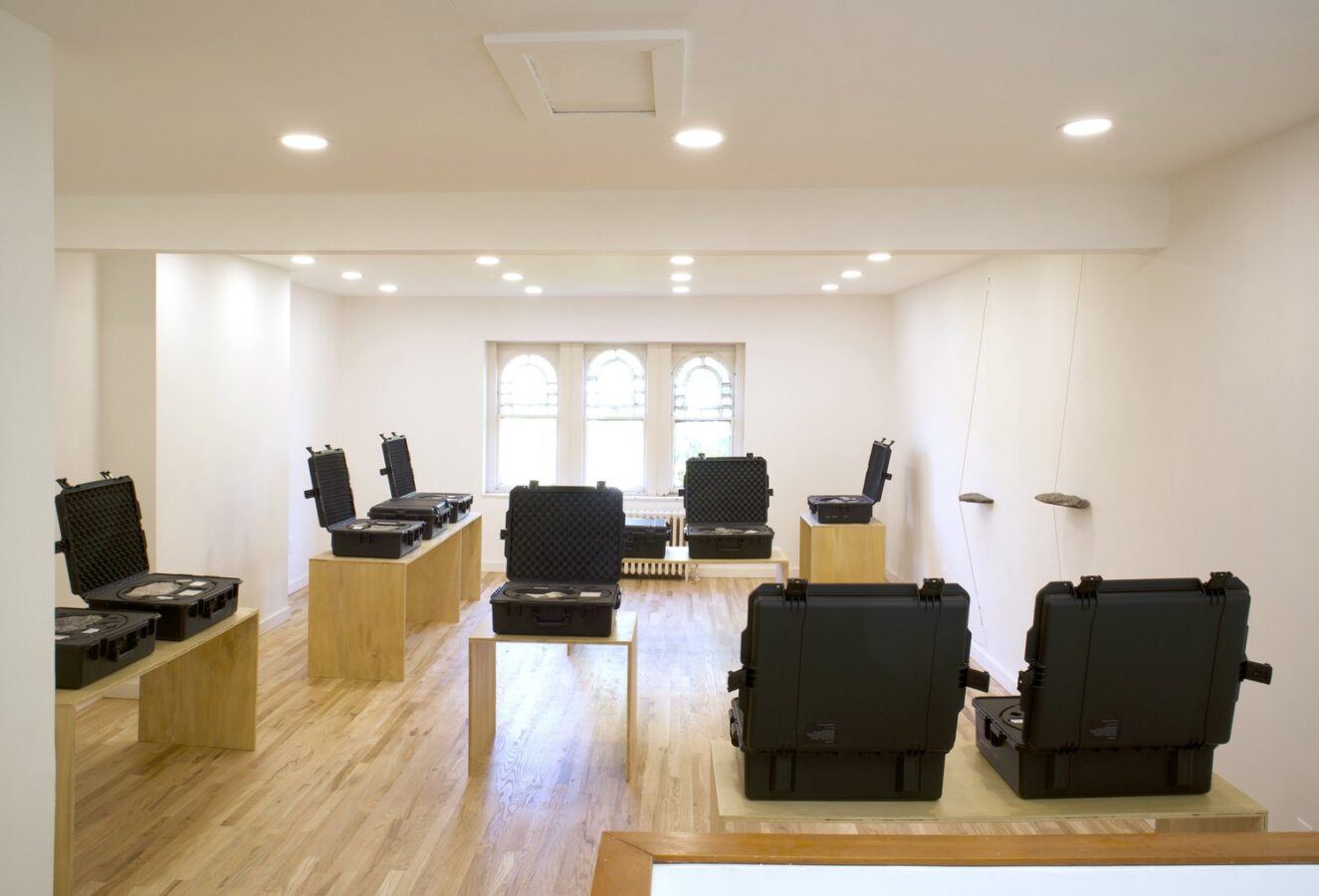 Perhaps what is most interesting about this editioned work is the tension created between the ephemeral nature of Drozd’s art, the instabilities of the natural world, and the solidified object-ness of these 12 pieces. The numbered, black weather-proof cases protect and preserve the artwork but also codify and conceal it. Will the owners of these editions choose to display the case, lid open, to showcase the aesthetically pleasing geometry inside? Install the piece on a wall and allow the piano string to reverberate and come alive? Keep the case shut and stored away, conserved but not in use?