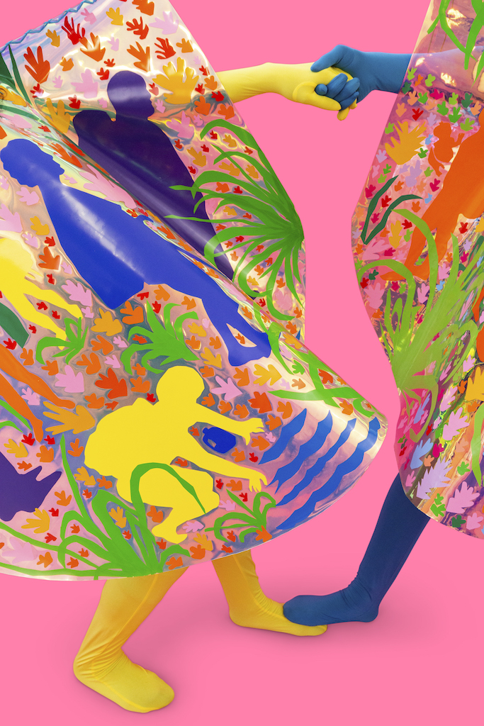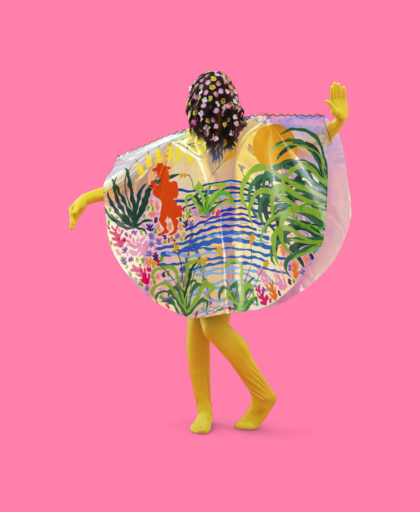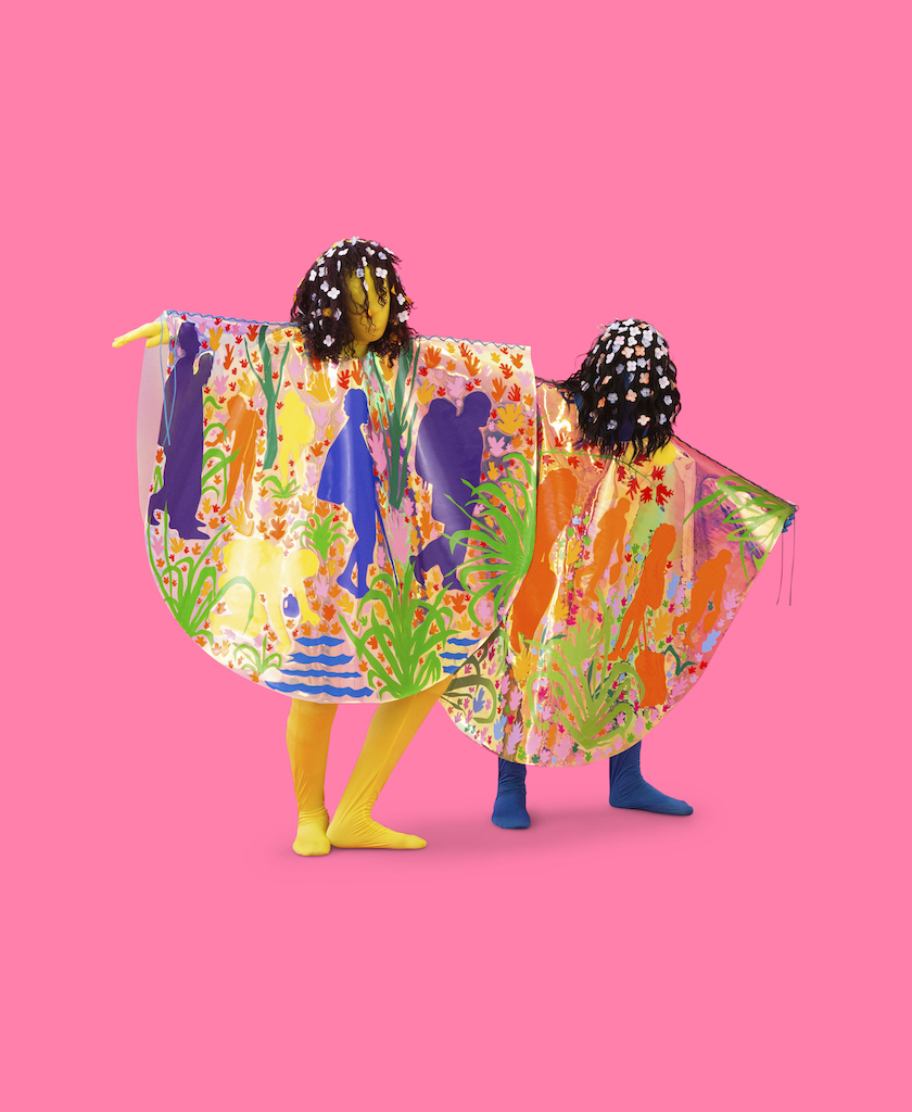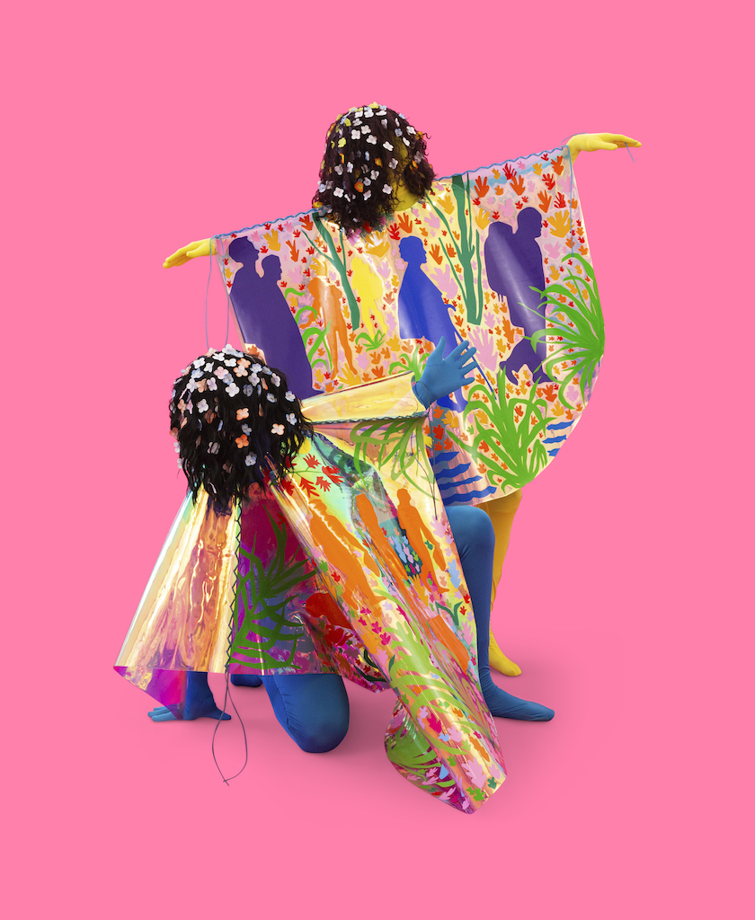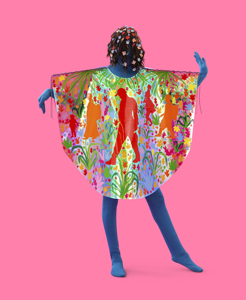Depicted in changing landscapes reacting to the climate crisis, the figures in Corona’s fiber-based works are at once specific and vague. A suitcase might be decorated in a cherry pattern but the face and features of the person pulling it are obscured by cascading hair. Corona’s vibrant work is often wearable. He has made full costumes, ponchos, and blankets meant to be worn in performance and also displayed in gallery settings. As a result, his solo installations have the dramatic tension of a stage set for the curtain to rise at any moment.