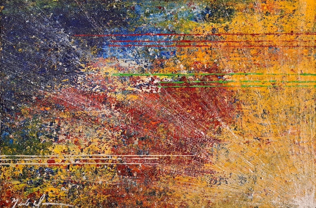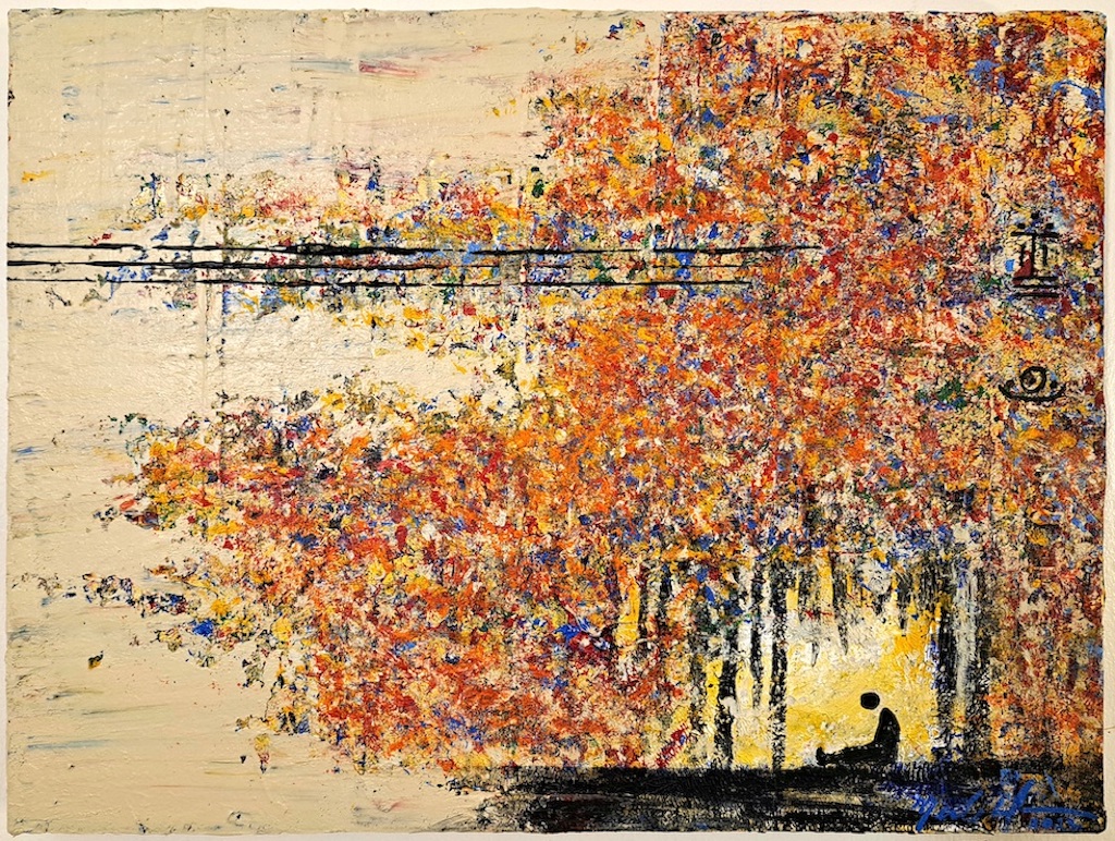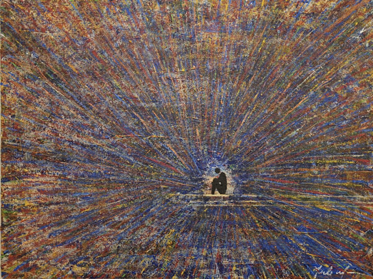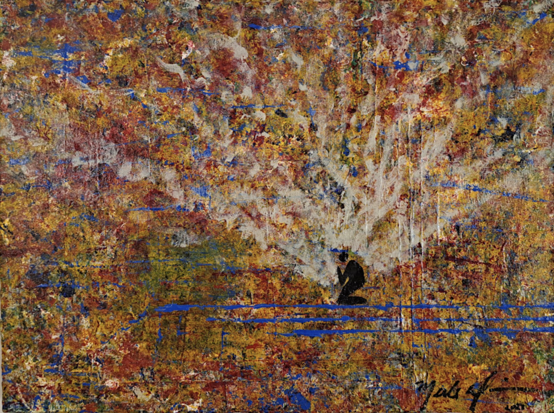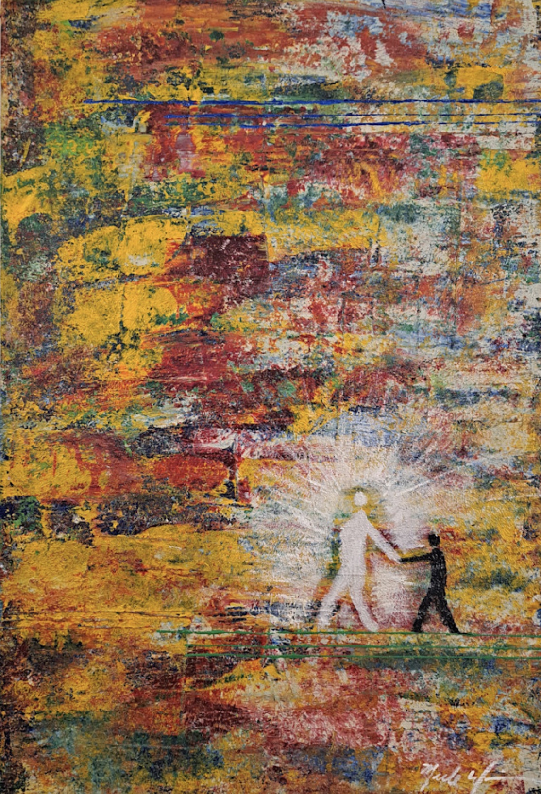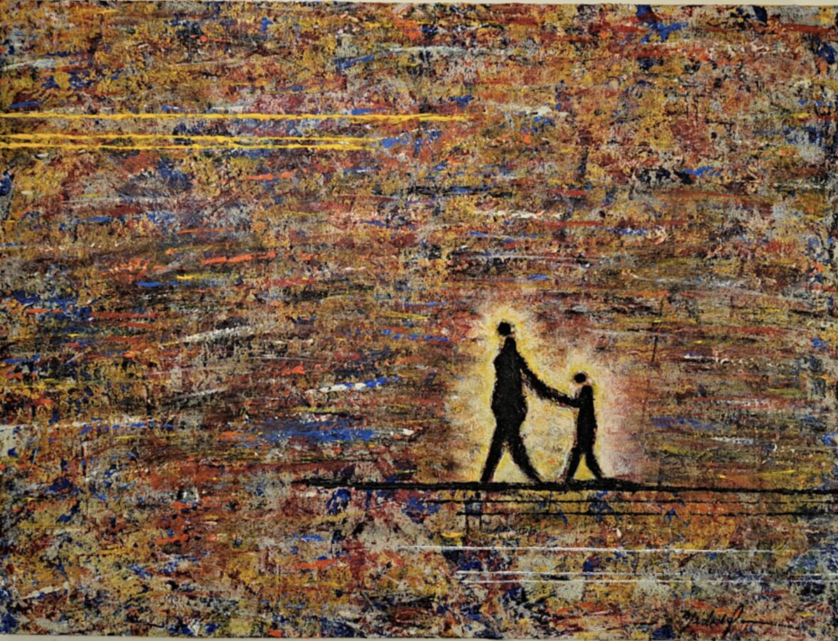 They form the beginning of Davison’s ongoing narrative, which follows an anonymous figure’s journey of grief. “Unpredictable Beauty” and “Rage” are both abstract paintings that are best appreciated as two sides of the same coin. The former depicts dynamic brushwork, swirls, and swatches in a wide spectrum of rainbow colors. Meanwhile, the latter is composed of languid, flame-like strokes of blue that glow against a yellow and orange background. The pieces flank “Shadows,” the first depiction of Davison’s anonymous subject. Two figures, an adult and child, walk hand in hand on a dark landscape, yet a halo of light surrounds them, signifying their strength as a pair.
