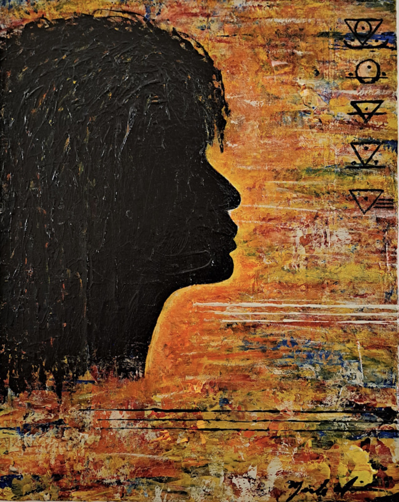 The journey continues onwards with “Beautiful Black As God Intended.” This piece features Davison’s own written language, only found in her artwork. Her proprietary alphabet is composed of triangles, circles, lines, and dots. Each symbol stands for a different word and includes definitions such as ‘intention’, ‘universe’, conjugations of ‘to be’, and more. “Beautiful Black” depicts the blacked out side profile of a woman’s bust on a vibrant abstract background, in addition to five ideograms organized in a vertical line along the canvas. Hidden behind the canvas, is the key to deciphering what the symbols mean. After translating it with Davison’s definitions, one discovers the symbols stand for the painting’s own title, each representing one of the words.