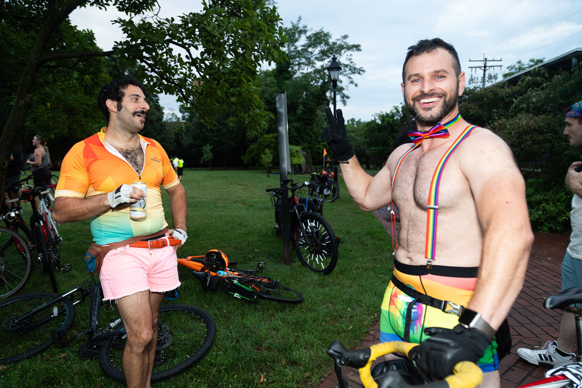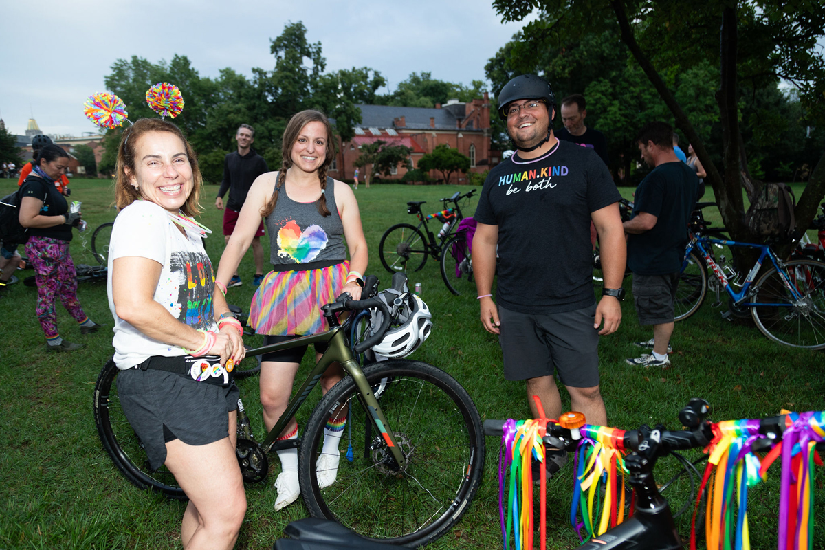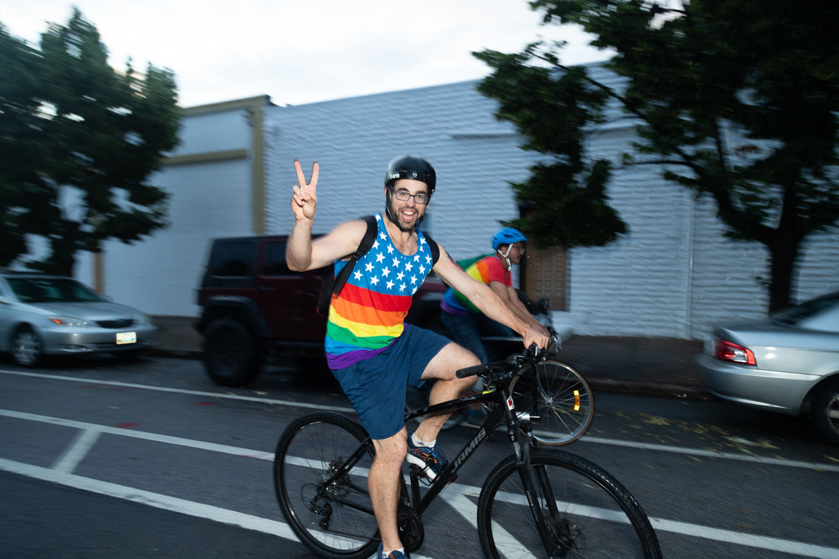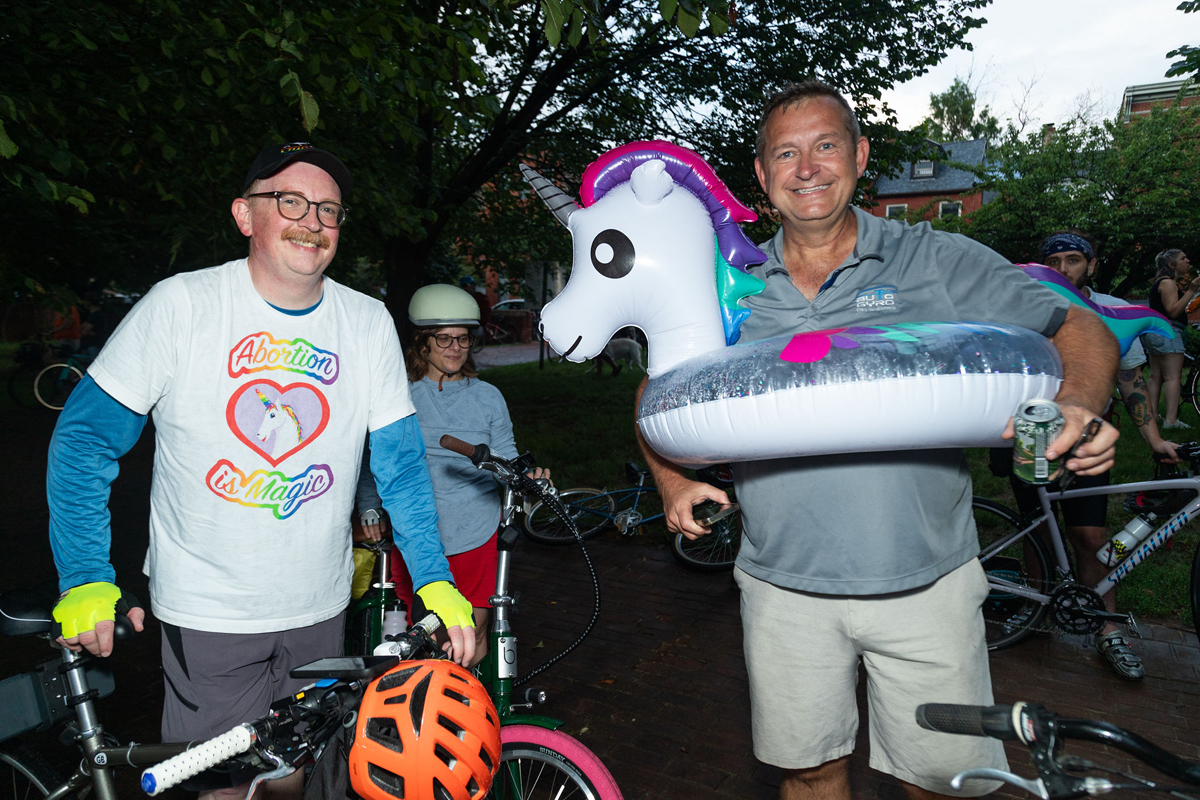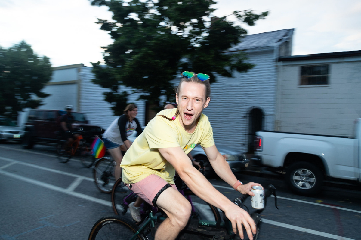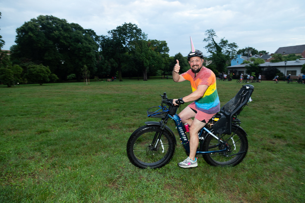 Baltimore Bike Party squeezed one last, glistening and glittery event into the tail end of Pride month. The Pride Ride took place June 30th, 2023, setting out at 8pm from St Mary’s Park, later than usual after two hours of rain, a thunderstorm and poor air quality (cue “Blame Canada”).