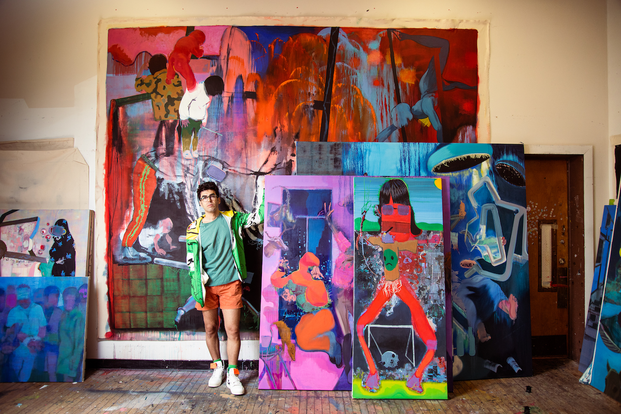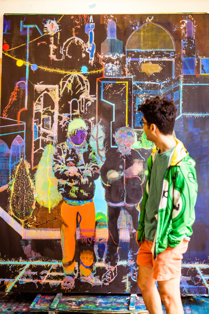 Standing in a flood of azure blue, a figure wearing a yellow t-shirt holds their arms aloft as if conducting an orchestra. Though one might expect the background figures to play instruments, they instead labor to lift objects from the flood, engaged in what might be disaster relief. Like many of Taha Heydari’s paintings, this canvas in his Federal Hill studio towers above my head. If a disaster persists across his work, it seems a fissure of orientation.