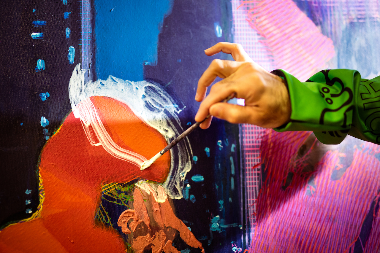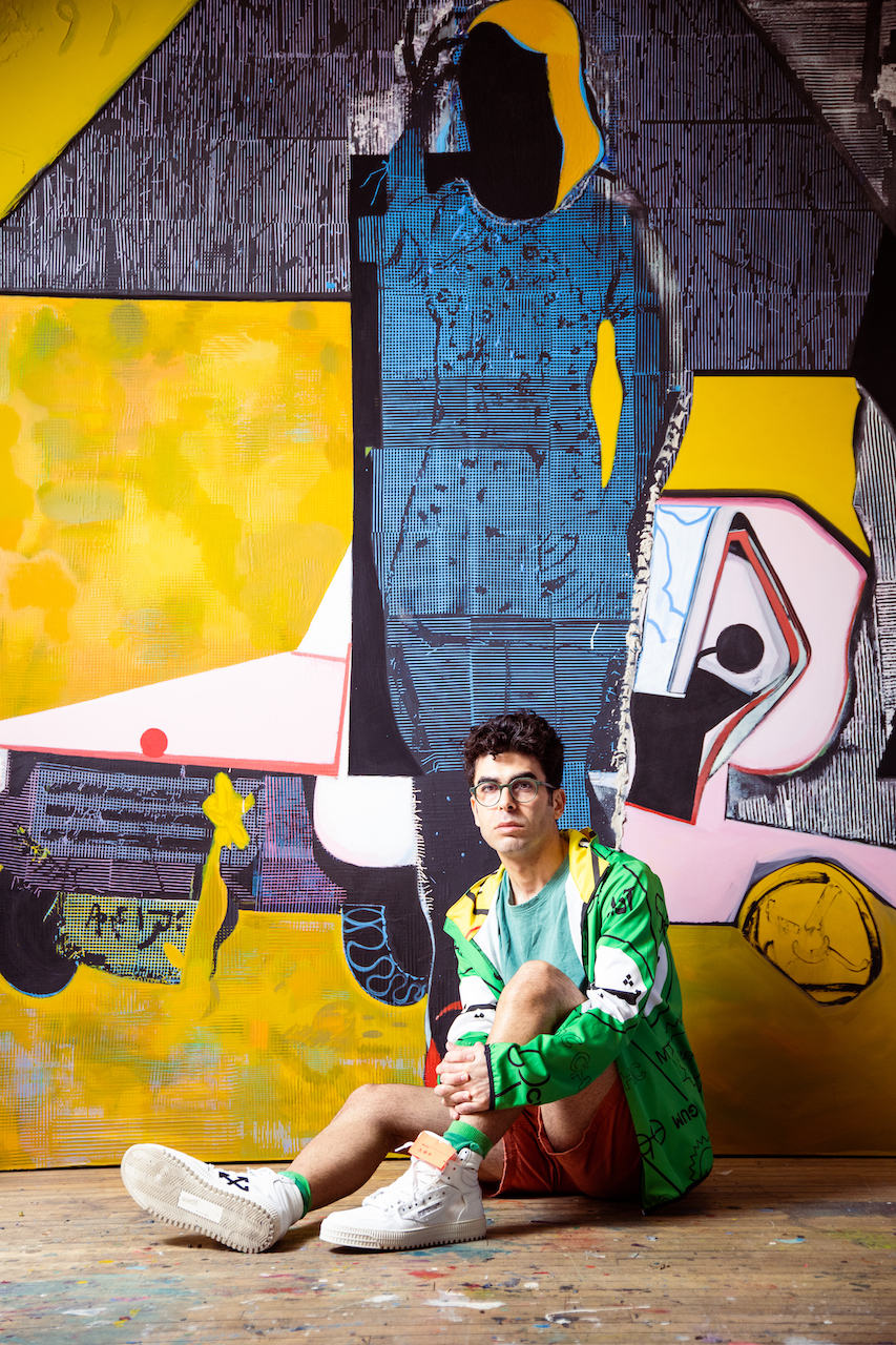 Heydari uses several tropes of fracture: bodies do not have definitive borders, facial features are indistinct or completely absent, and his hallmark grids that compose huge swaths of these large-scale paintings are torn and frayed at the edges. Though he paints in acrylic, his pieces initially look like mixed-media collage assembled with digital material. Consequently, these fractures read as glitches—and the fact that these glitches are physically created emphasizes how our material reality is just as precarious as our digital worlds. They are susceptible to transfer or corruption.