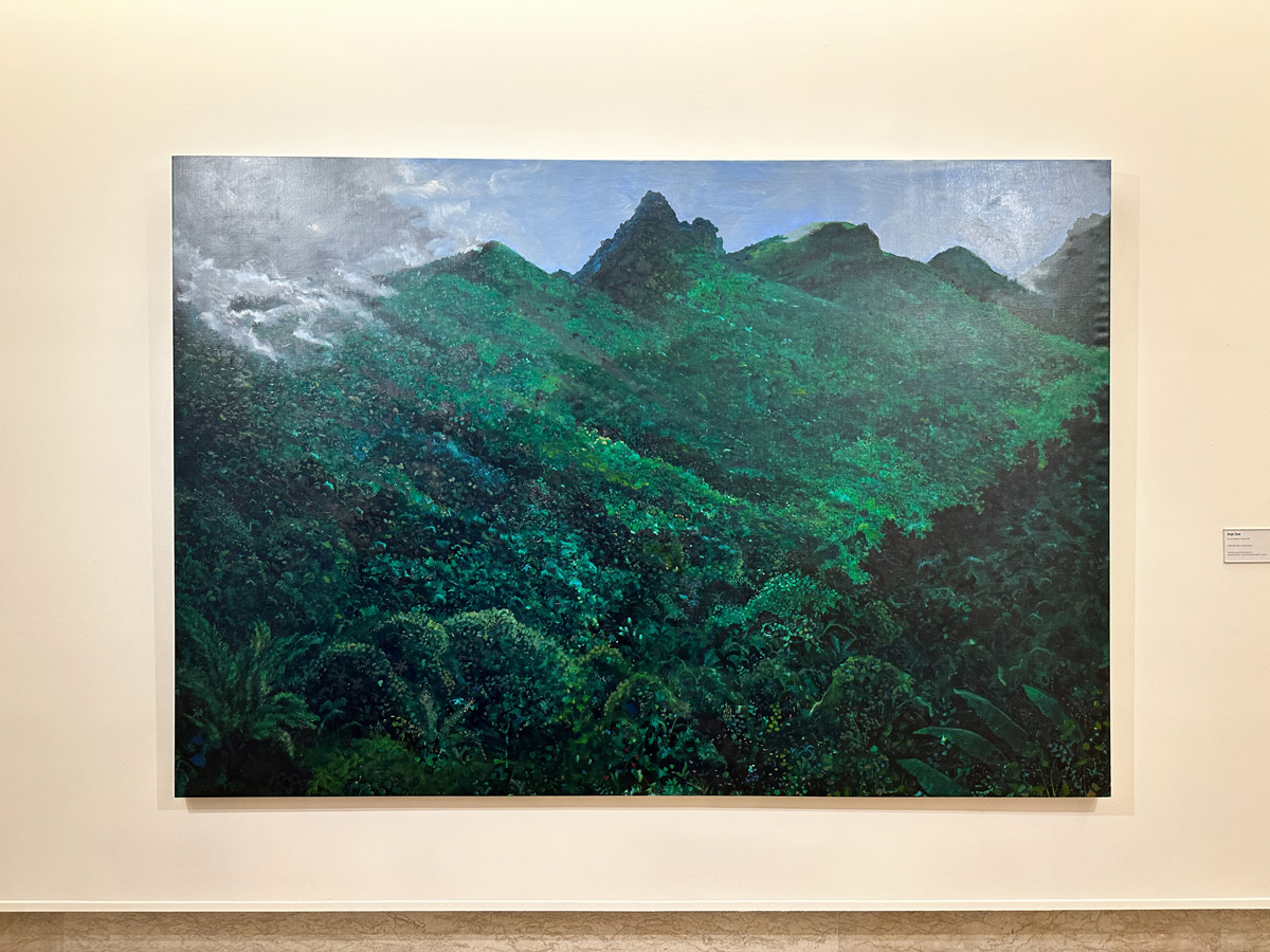The landscape exhibition’s most notable work is a large acrylic on canvas, “The Last Mountain, El Yunque” by Jorge Zeno. The painting depicts the titular tropical rainforest, El Yunque, located in the northeastern coast of Puerto Rico and home to the island’s tallest waterfall. As one of the island’s top tourist destinations, I also have many memories of hikes and excursions taken through the forest, which always culminate by reaching the waterfall and taking a well deserved dip in its ice cold waters.