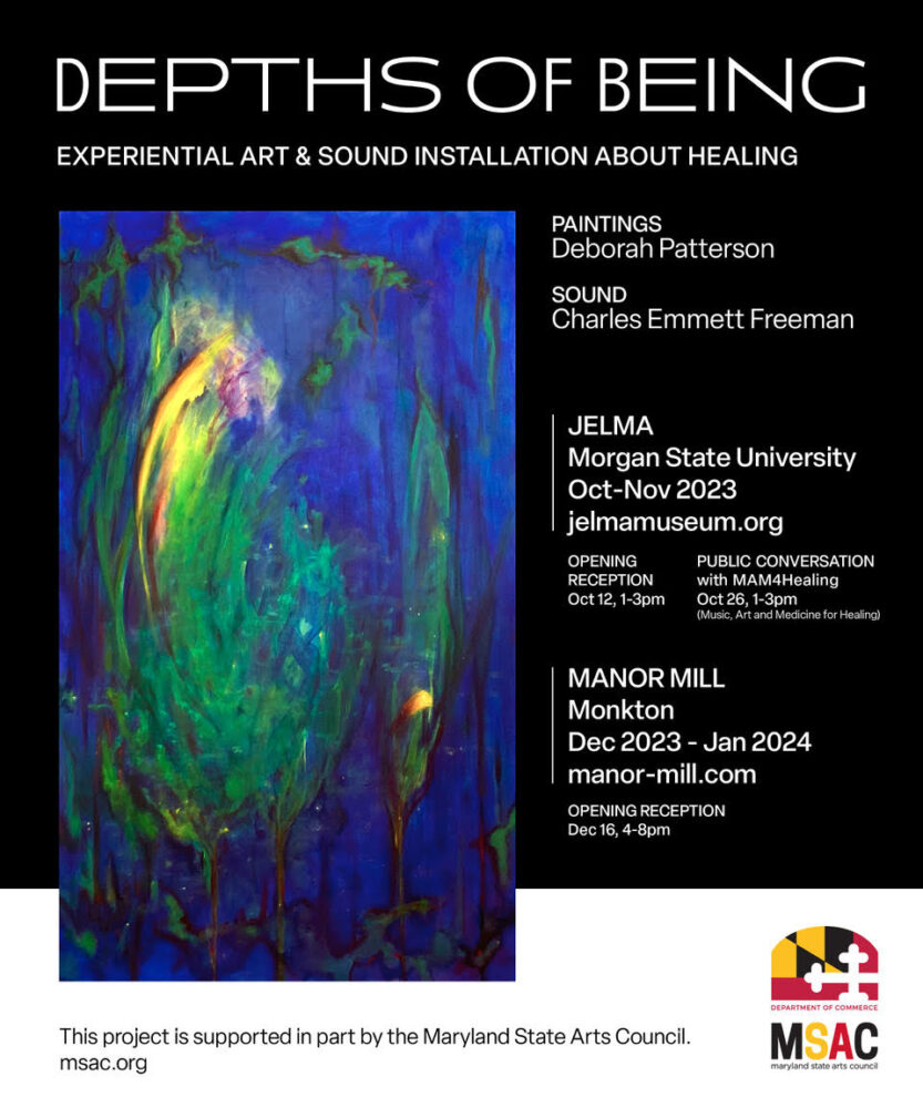 This groundbreaking exhibition features six large oil paintings by Deborah Patterson that interpret the six “Depths” of Jin Shin Jyutsu (JSJ), a Japanese healing art used to restore harmony to the body by simply holding one’s fingers. Deborah’s nearly fifteen year experience with JSJ has been so positive, her goal is to share it widely. Accompanying the paintings is original music by experimental musician/composer, Charles Emmett Freeman. In 2022 Charles suffered a hemorrhagic stroke, which has led both to an interest in healing and an entirely different approach to his music. For this project, he has tuned his compositions to healing frequencies that can be traced back to Sanskrit chants, 8th c. Gregorian chants, and 11th c. harmonics. Participants will experience JSJ firsthand as they engage with the paintings and music. Both artists received grants from the Maryland State Arts Council to complete their work.