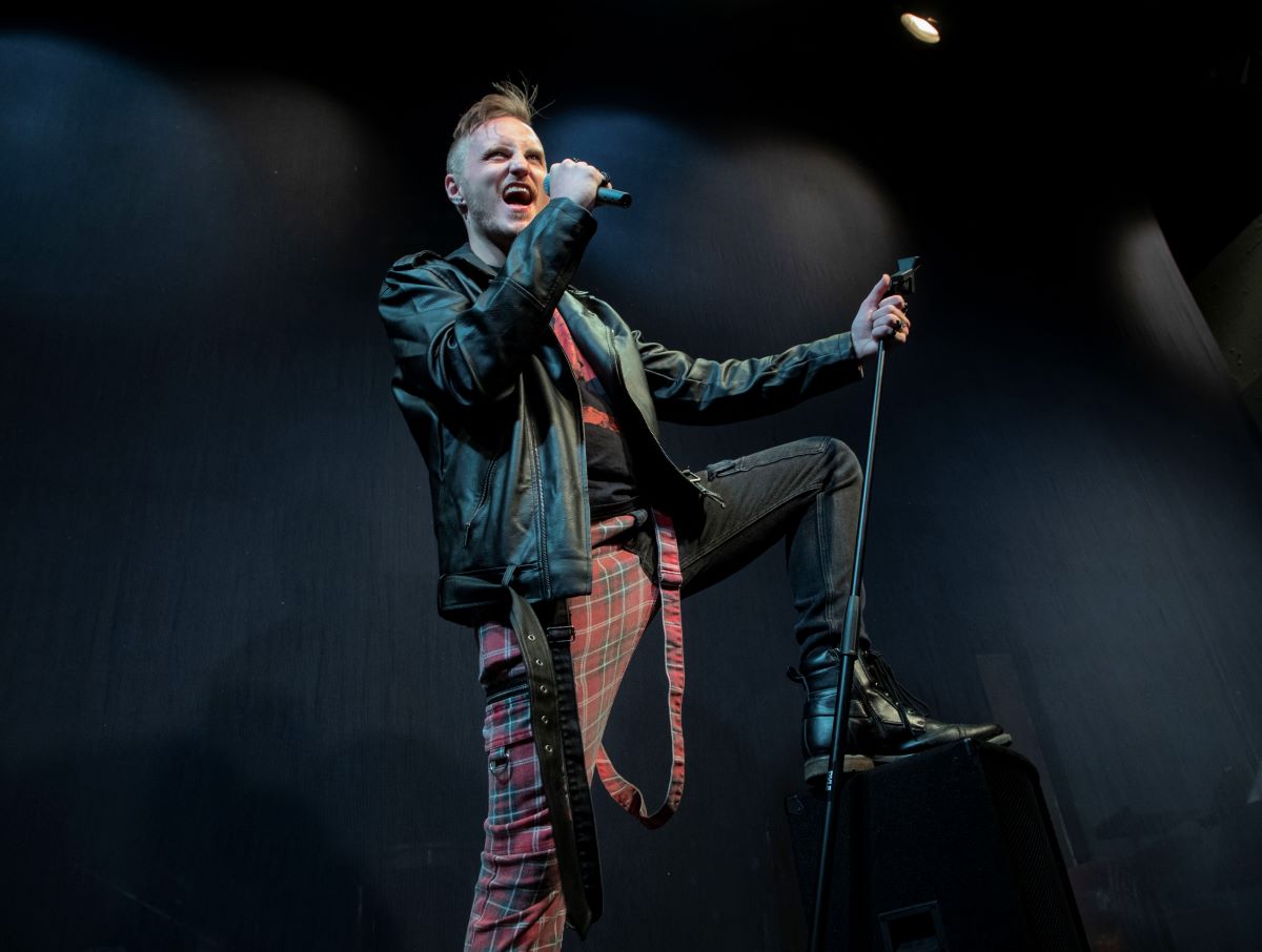 The Vagabonds’ production was conceived, according to the director, to be “a play last, and first and foremost a concert.” The overall style of the production is a 1980s discotheque. Geometric patterns are projected on the back and side walls of Stephen Deininger’s set. The effective lighting, by Kaite N. Vaught, includes plenty of special effects; Audra M. Mullen’s costumes reflect the fashions of the 80s. Katie Sheldon’s choreography seamlessly blends disco moves and movements necessary to the action.