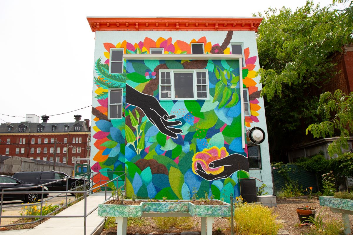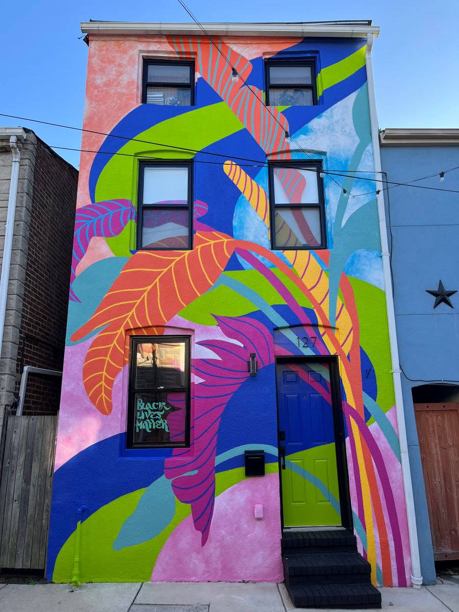If you’re lucky, you’ll spot one or two while strolling through Baltimore’s brick-lined streets. A flash of color, a burst of movement. The bright tapestries stand out from afar, rainbows wrapped around unassuming buildings. Perhaps you’ve already seen them, peered up at a fortuitous moment and found your eyes frozen, wandering up and down, left and right, circling the intricate marks and luscious hues.