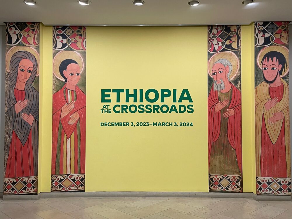 Among the first works in the Walters Art Museum’s recently opened Ethiopia at the Crossroads (through March 3) is a delightful 18th-century canvas mural that depicts, among other things, a rapt Virgin Mary. Wide-eyed, she gestures in demure astonishment as she receives a wafer from her precocious child. But her gaze also wanders towards a handsome vessel gently extended by a priest. Agog, Mary is vibrantly alert to the appeal of material objects—and to the broad implications that lie behind them.