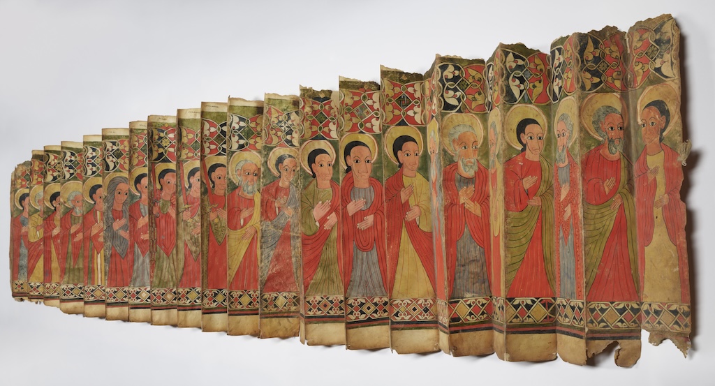 In that sense, she offers a sort of model for those who visit this rich, ambitious exhibition, encouraging us to look for overarching meanings. For instance, the mural points to the centrality of religious art in Ethiopia—which, in addition to being one of the oldest Christian nations, can boast of significant Jewish and Islamic patrimonies. And its formal aspects (thick outlines; bold fields of color; restrained modeling) support, in their vaguely Byzantine aspect, the show’s central claim that Ethiopian art has always been profoundly influenced by regional traditions. Look closely enough, the Virgin’s eyes suggest, and you may begin to see in new ways.