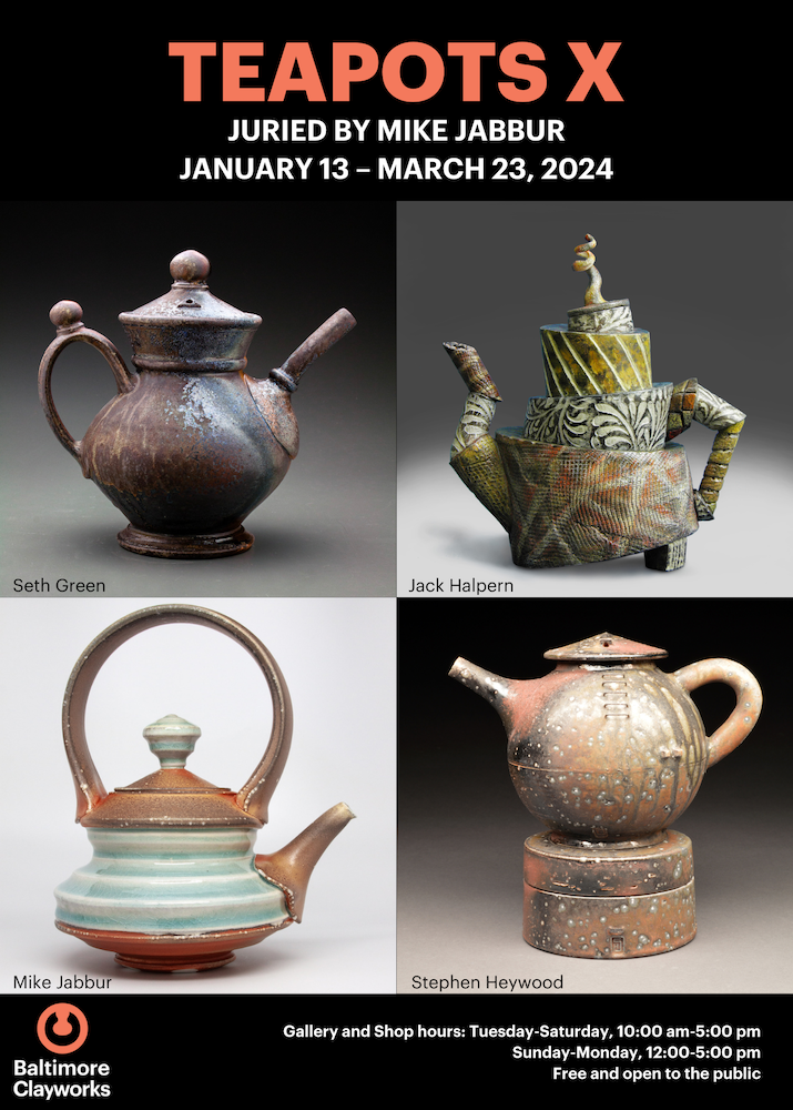Baltimore Clayworks proudly presents our 10th biannual juried exhibition, “Teapots X.” The juror, Mike Jabbur, selected the strictly functional and sculptural teapots created by 64 emerging and established artists from U.S., including Alaska and Hawaii, and Canada.