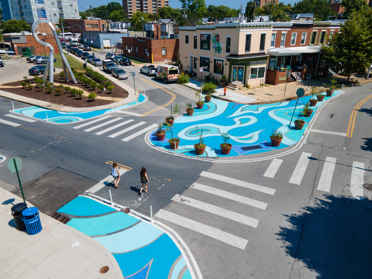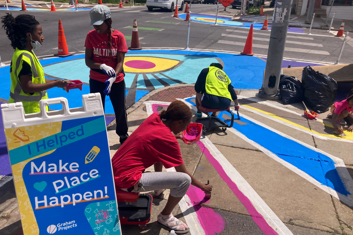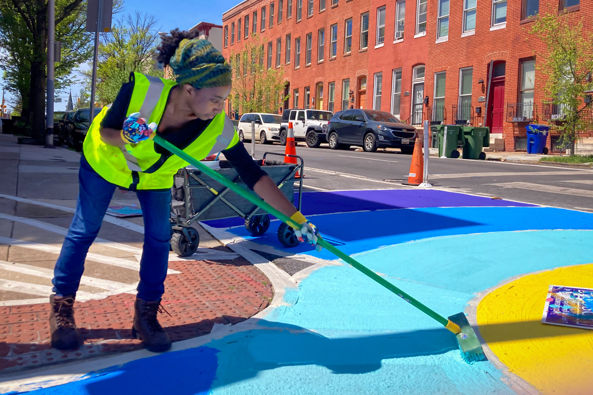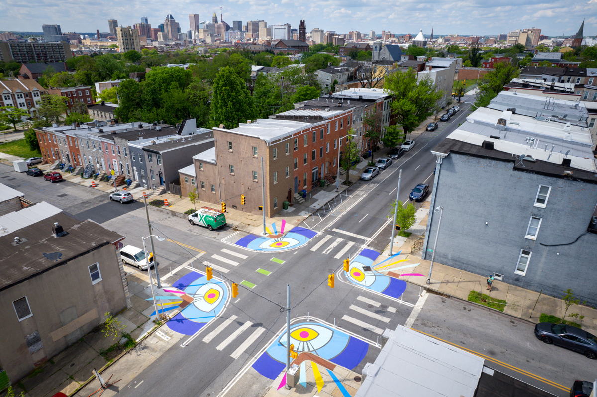 That sounds like the kind of hyperbolic praise some artists would receive for an emotionally uplifting painting or song. But Coreil-Allen’s collaborative “painting” practice—colorfully cascading across sidewalks, asphalt, and other infrastructure—is as much about the objective probability of preventing deaths as subjective aesthetics. Through his company Graham Projects, which offers a mix of urban design, public art, neighborhood advocacy, and placemaking services, Coreil-Allen and his team have transformed streets in Remington, Station North, Pigtown, Druid Hill, and beyond. Many of their projects are graphic, eye-catching murals designed to slow drivers down at intersections and reclaim a bit of public space from private vehicles, making the city safer, block by block.