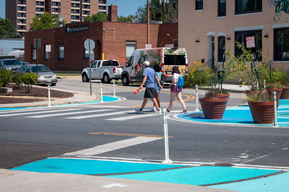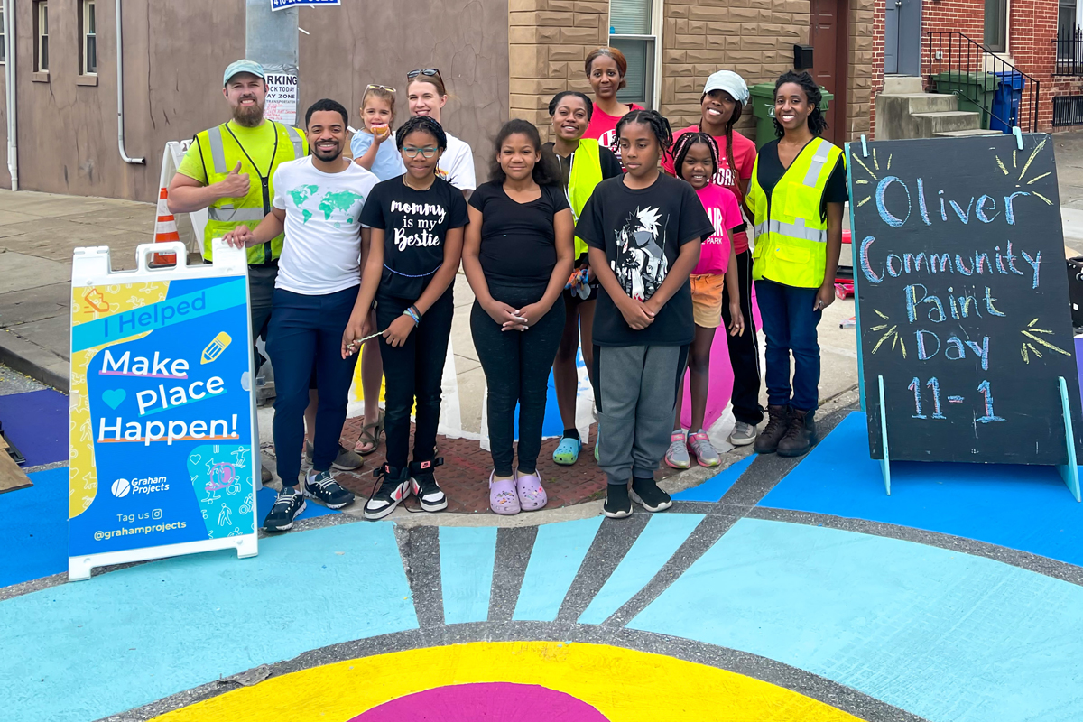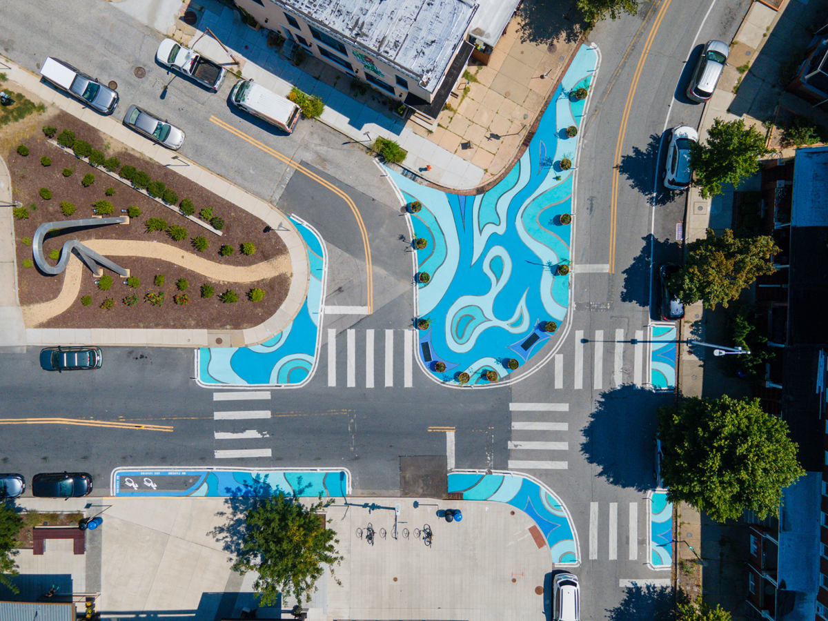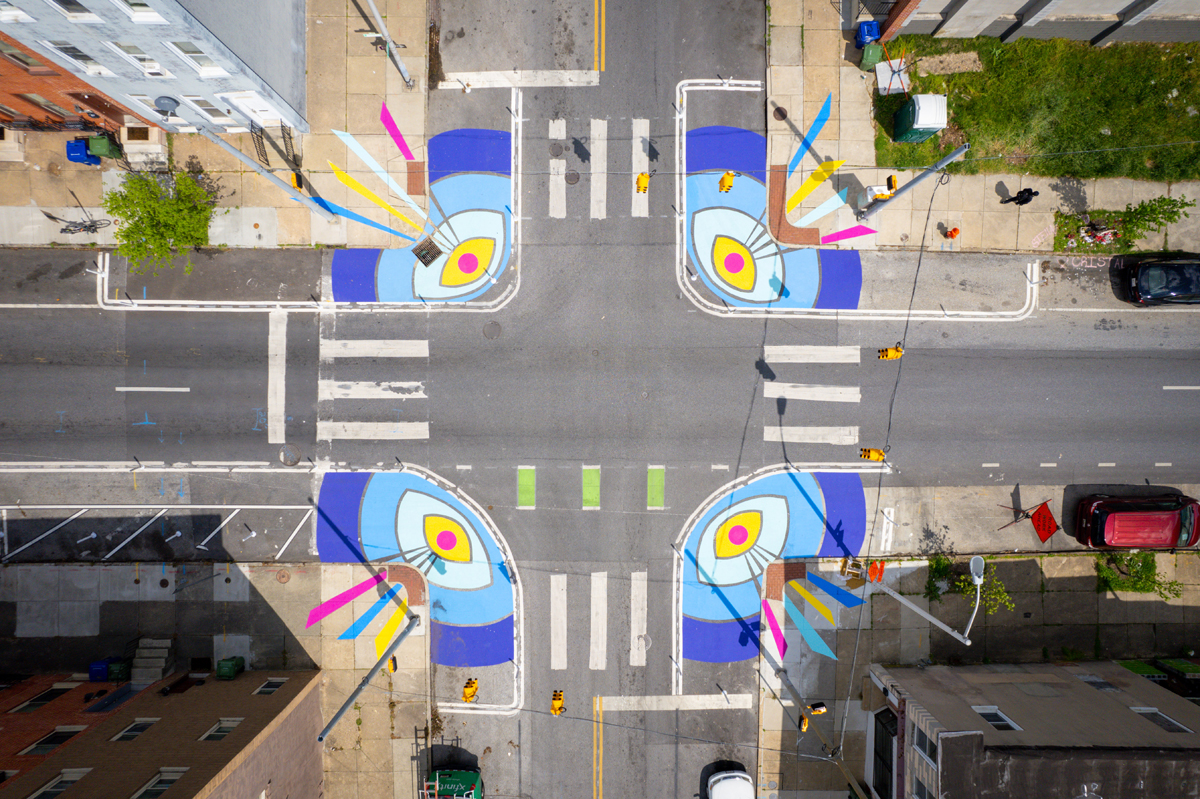That sounds like the kind of hyperbolic praise some artists would receive for an emotionally uplifting painting or song. But Coreil-Allen’s collaborative “painting” practice—colorfully cascading across sidewalks, asphalt, and other infrastructure—is as much about the objective probability of preventing deaths as subjective aesthetics. Through his company Graham Projects, which offers a mix of urban design, public art, neighborhood advocacy, and placemaking services, Coreil-Allen and his team have transformed streets in Remington, Station North, Pigtown, Druid Hill, and beyond. Many of their projects are graphic, eye-catching murals designed to slow drivers down at intersections and reclaim a bit of public space from private vehicles, making the city safer, block by block.