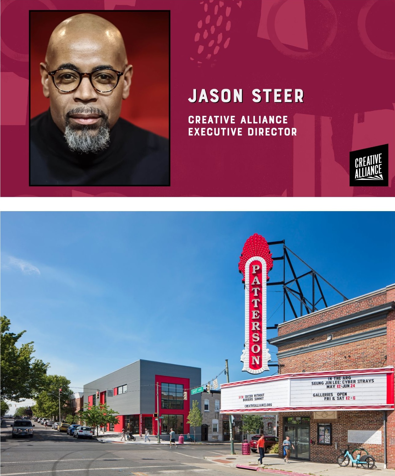 Steer hits the ground running, officially starting at Creative Alliance on February 1, and has moved his residence to Baltimore. “I love how welcoming and charming everyone has been at Creative Alliance. I am excited about the work they’ve done so far and the work we will do in the future. I look forward to having some fun, and I think the goal is always to produce work that shares joy.”