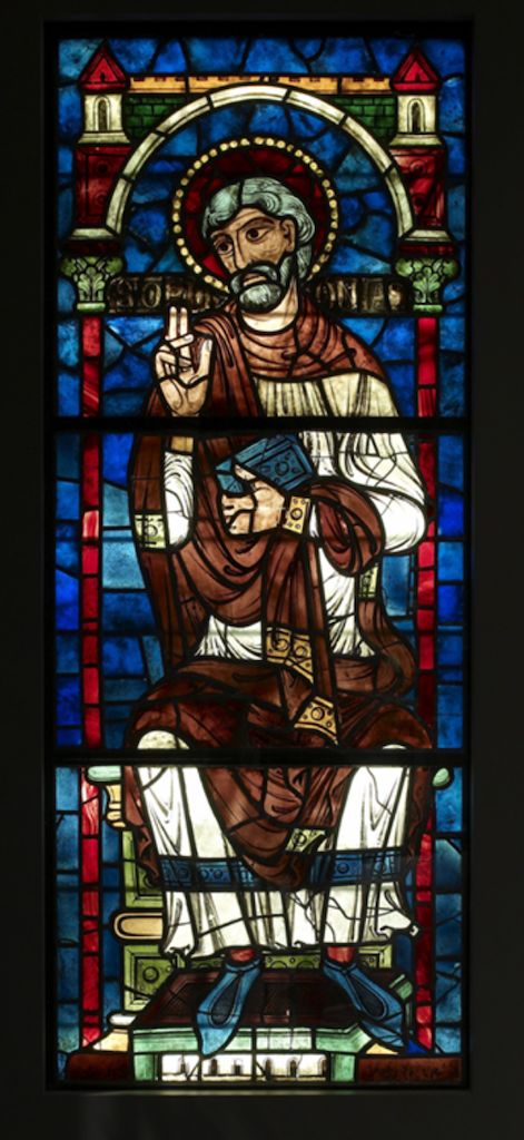In contrast to—yet also in harmony with—Jean-Auguste-Dominique Ingres’s 19th-century stained-glass work of the same title, Wiley’s glasswork portrays a young, serene Black man of today, rather than the eighth-century Christian saint. Instead of robes and sandals, his saint, Kern Alexander, wears Converse sneakers, cuffed jeans and a hoodie—typical garb of any ordinary city man the world over. Wiley’s work asks for a moment of pause to absorb and pay respect to such men who have maintained strength in the face of unremitting discrimination, inhumanity and—in many cases—violent premature death. Keyed to a color palette of rustic reds, Victorian greens and mired gold often found in African nation flags, Wiley also alludes to the rich cultural heritage of those regions, the roots of his subjects.