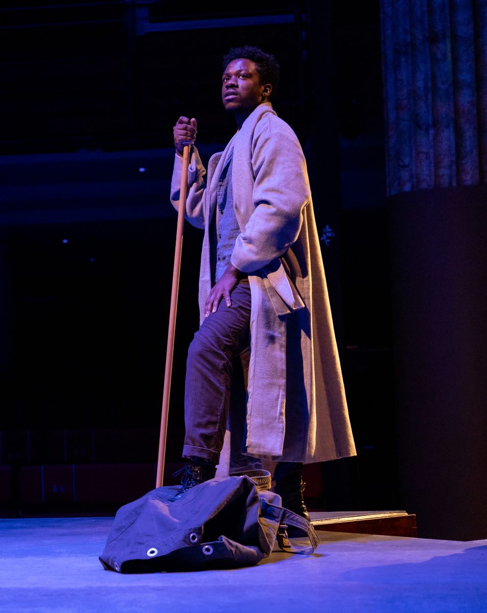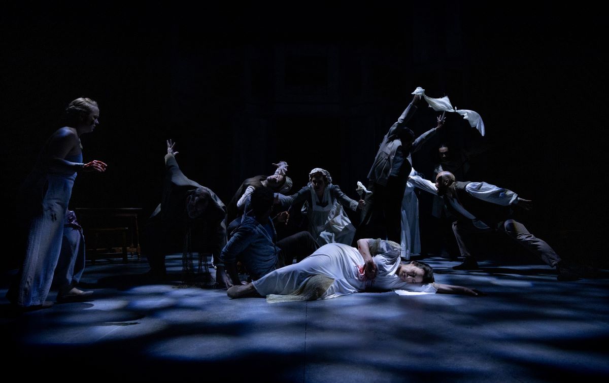 Using a single chorus allows McLaughlin to end the separation of the chorus and the leads which was so important to the Greeks. In her version, the main characters move among and speak to the chorus members as individuals and they reply in kind. The result is that the chorus become members of the cast. They give the audience the backstory; they also grouse and bicker and undercut the lofty speeches of the leads. After Clytemnestra recounts a dream that fills her with foreboding, one of the maids (Hana Clarice) grumbles, “Why do I have to listen to everyone’s nightmares?”
