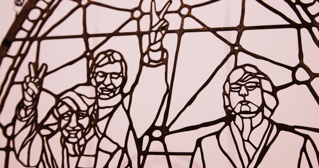Time and space play a key role in Unrested, as the exhibition is inherently tied to its locality. The artworks represent points in time with their titles being a specific year that most closely relates to whatever is happening in the piece. For example, “1954, 1969, 1971” is an interactive triptych consisting of three hanging metalwork frames and an augmented reality component. The artwork references Loyola’s stained glass windows while exploring what kinds of heroes its students would elevate in the modern day.