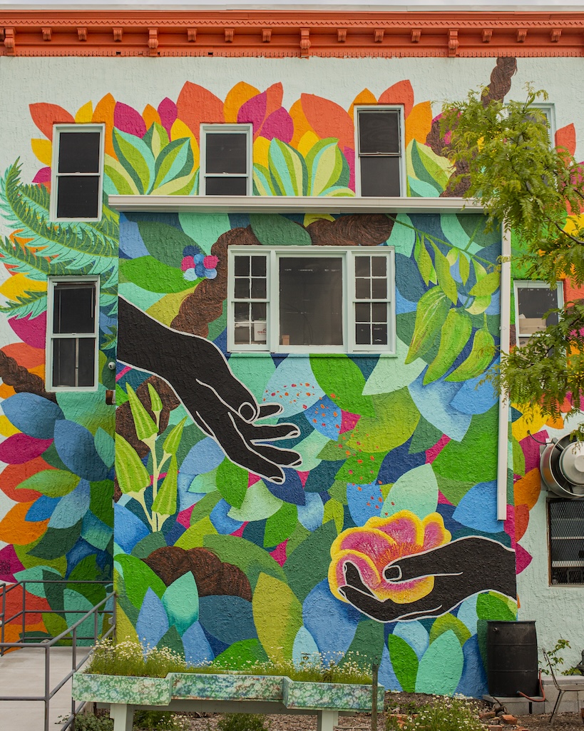 Just underneath the vibrant mural, onlookers will find a well-stocked herbal garden full of medicinal herbs available to the community to take from as needed. Inspired by her work as a doula and her love of foraging, Chef Kiah explains the herb garden is a way to showcase what plants and foods can be used as medicine. There’s a garden bed focused on gut health, a bed focused on nerve support and sleeping—so people can heal themselves. Each bed is set up to relieve a specific sickness.