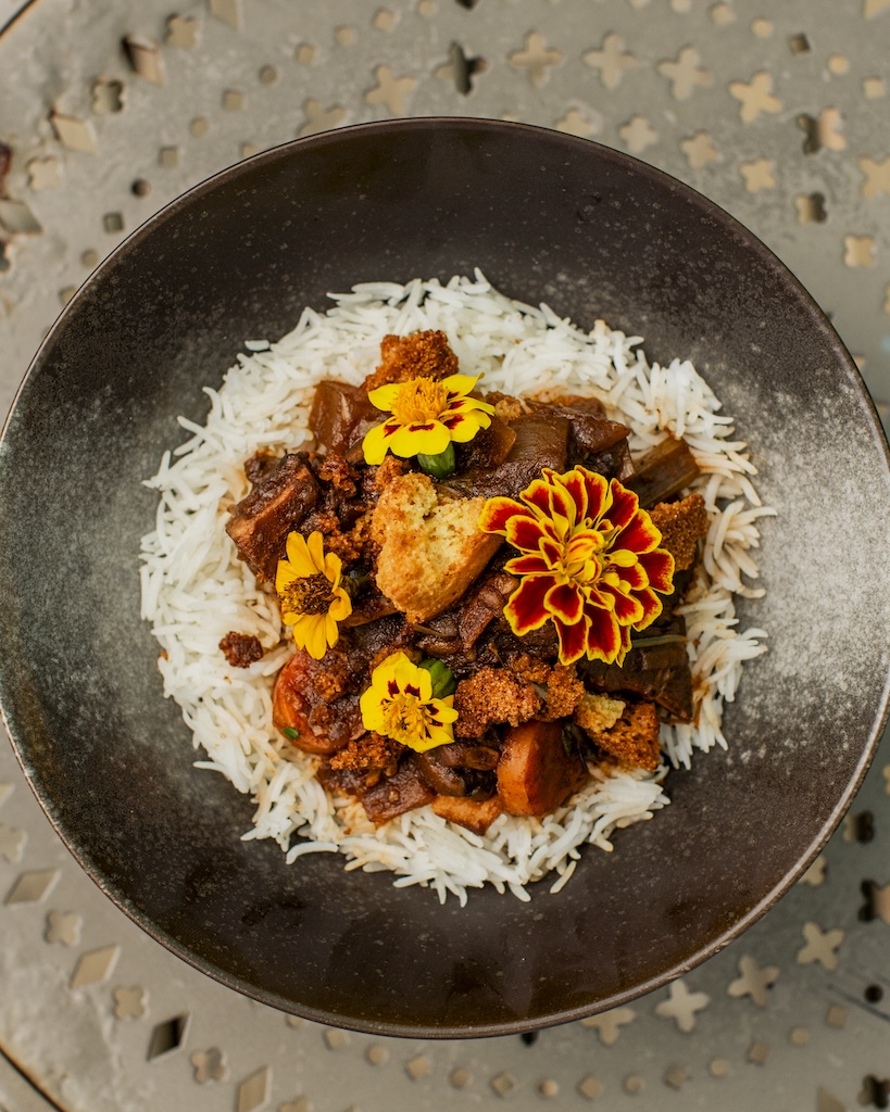 My senses are activated and overwhelmed by each perfect note: the dense yet airy crumb of the challah bread; slices of bruleéd bananas warmed in aromatics and glazed in a bath of butter and sugar; and then, amidst the softness, the crunch of a tree nut releasing its bitter and earthy notes into the sweetness. Finally, the cajeta—a goat milk dulce de leche—releases layers of flavor. It’s rich but vibrant and tart, like licking caramel from a gold spoon. The tanginess of the goat milk penetrates through at the exact moment saltiness from the challah releases on my palate, and suddenly, I feel it. Tears well in my eyes. It’s the perfect bite.