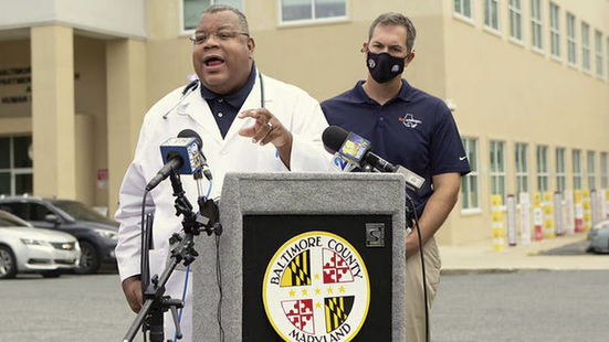 Dr. Gregory Branch and County Executive Johnny Olszewski speak to the media during the Covid pandemic in front of health department offices on York Road. (Baltimore County handout)