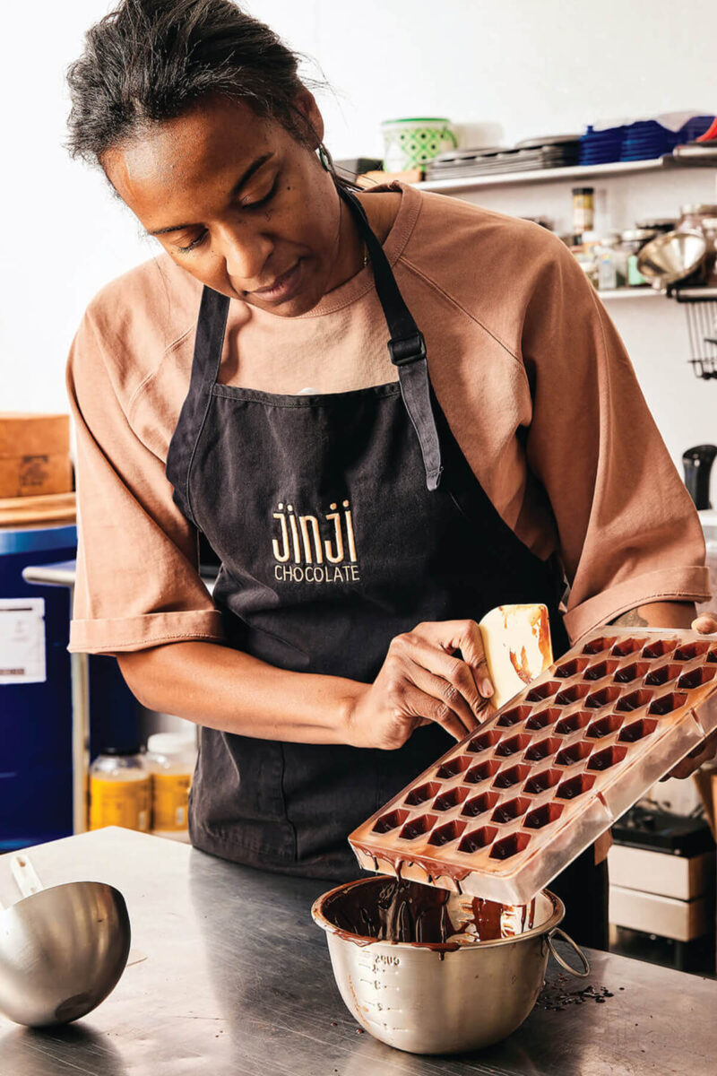 Jinji’s Chocolate is a chocolate shop, first and foremost, filled with rows of truffles with currants and cranberries, piles of Tuskegee pecan turtles, lines of peanut butter fudge, and trays stacked with Turkish figs stuffed with peanut butter ganache. But ever since opening last October, it’s also quickly become a community hub, whether that means collaborating with neighbors like Local Color Flowersfor an edible flower class, hosting a traditional mole dinner with Neopol Smokery, or providing a place for local musicians to perform as patrons stand at the high-top table and enjoy the vibe over cups of hot drinking chocolate.