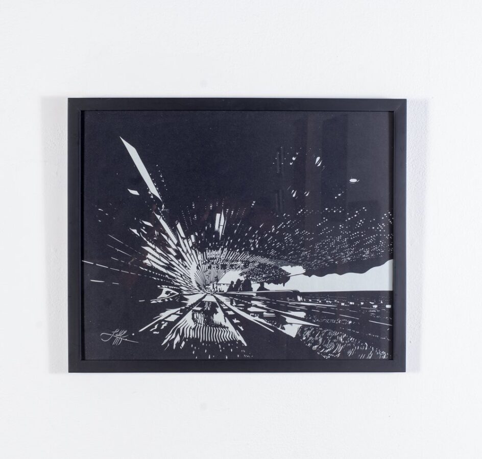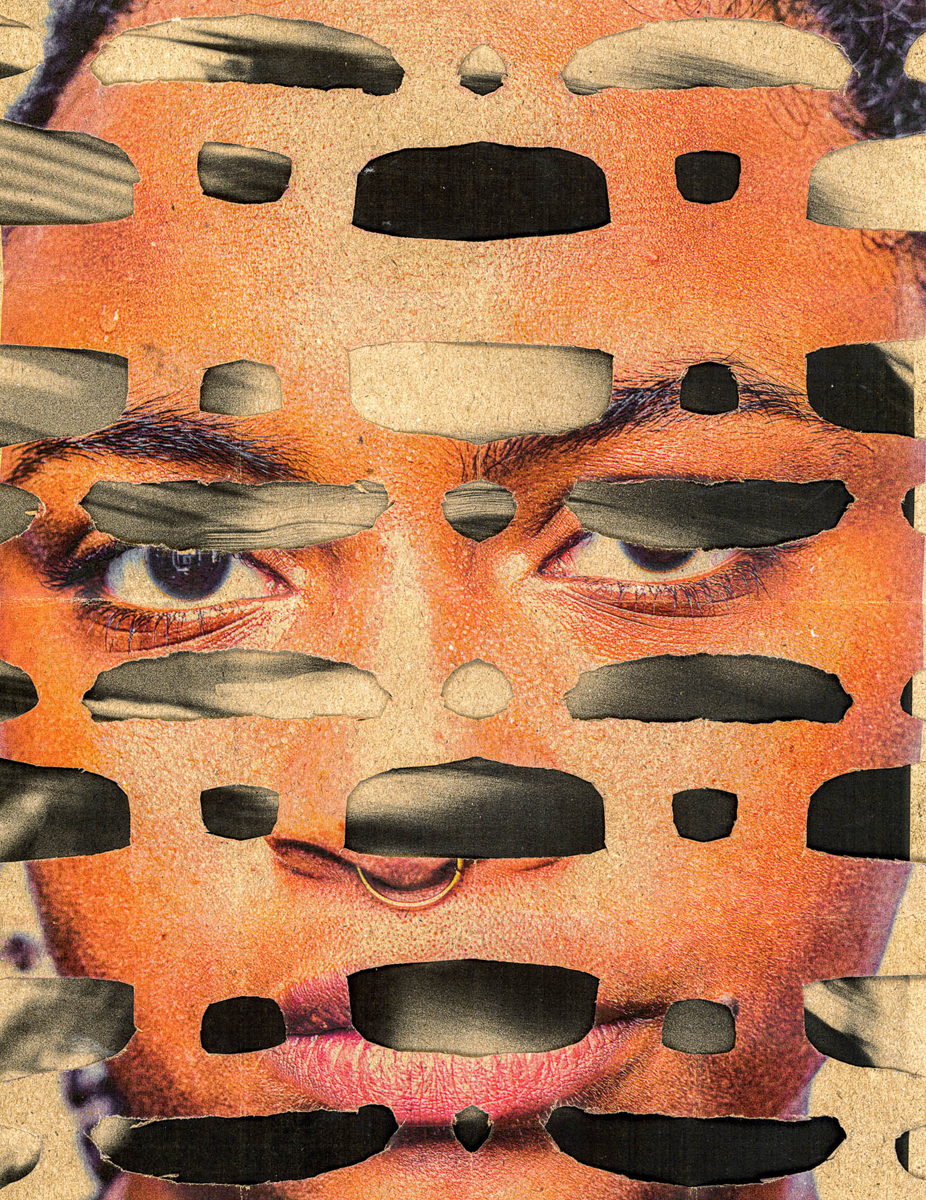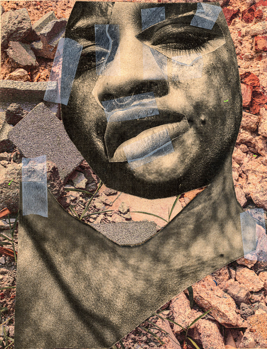 “Portrait(s) Contact #87” is a collage of black and white photo cutouts of the artist’s facial features on a brick background. Her features are enlarged and tilted, inciting an uncanny feeling when we almost don’t recognize Marimutu as the subject. The piece is reminiscent of those moments when we stare so long at a picture of ourselves that our own faces become unrecognizable, pointing out how an eyebrow sits higher than the other or how our smile is crooked until all of our features seem distorted and foreign.