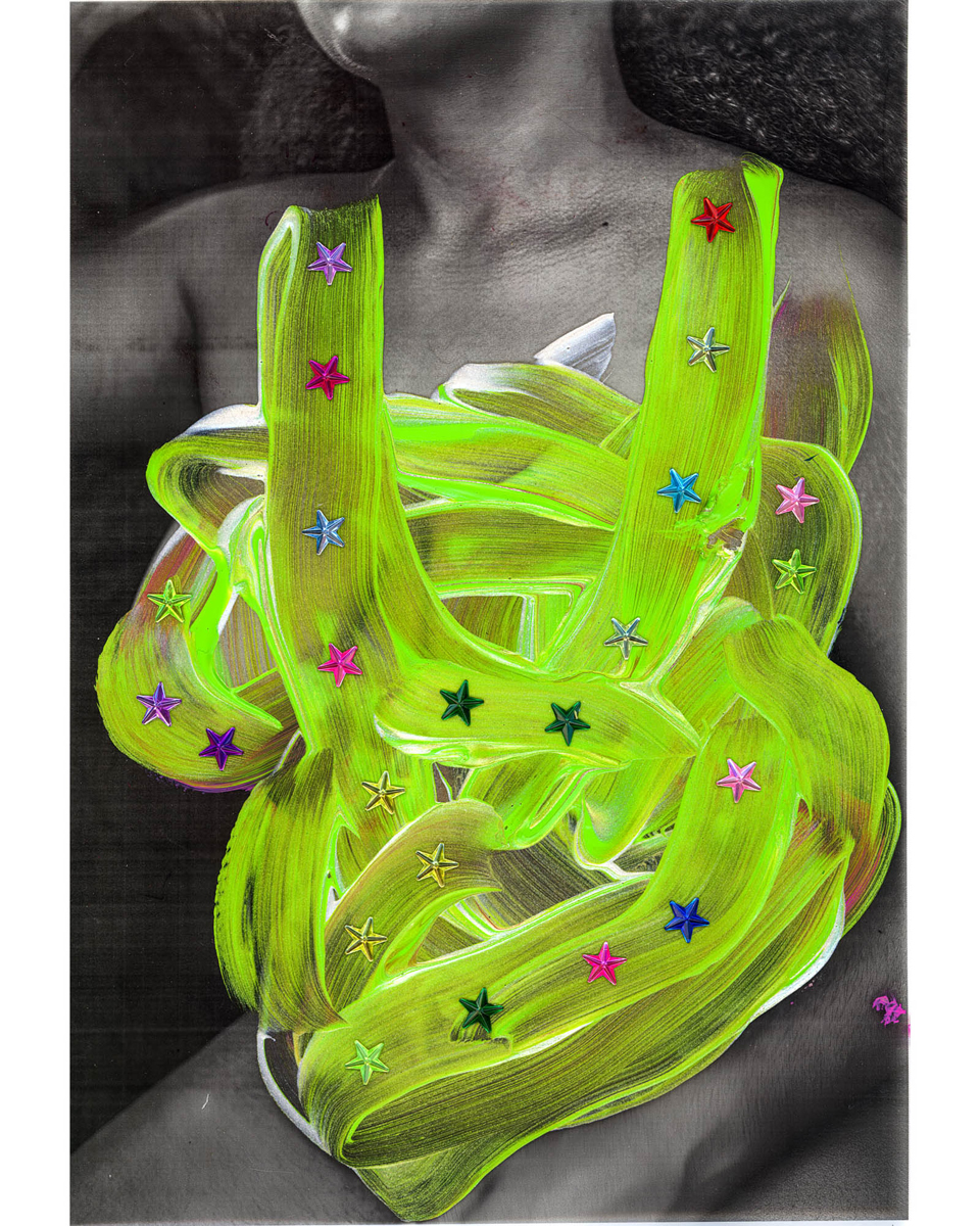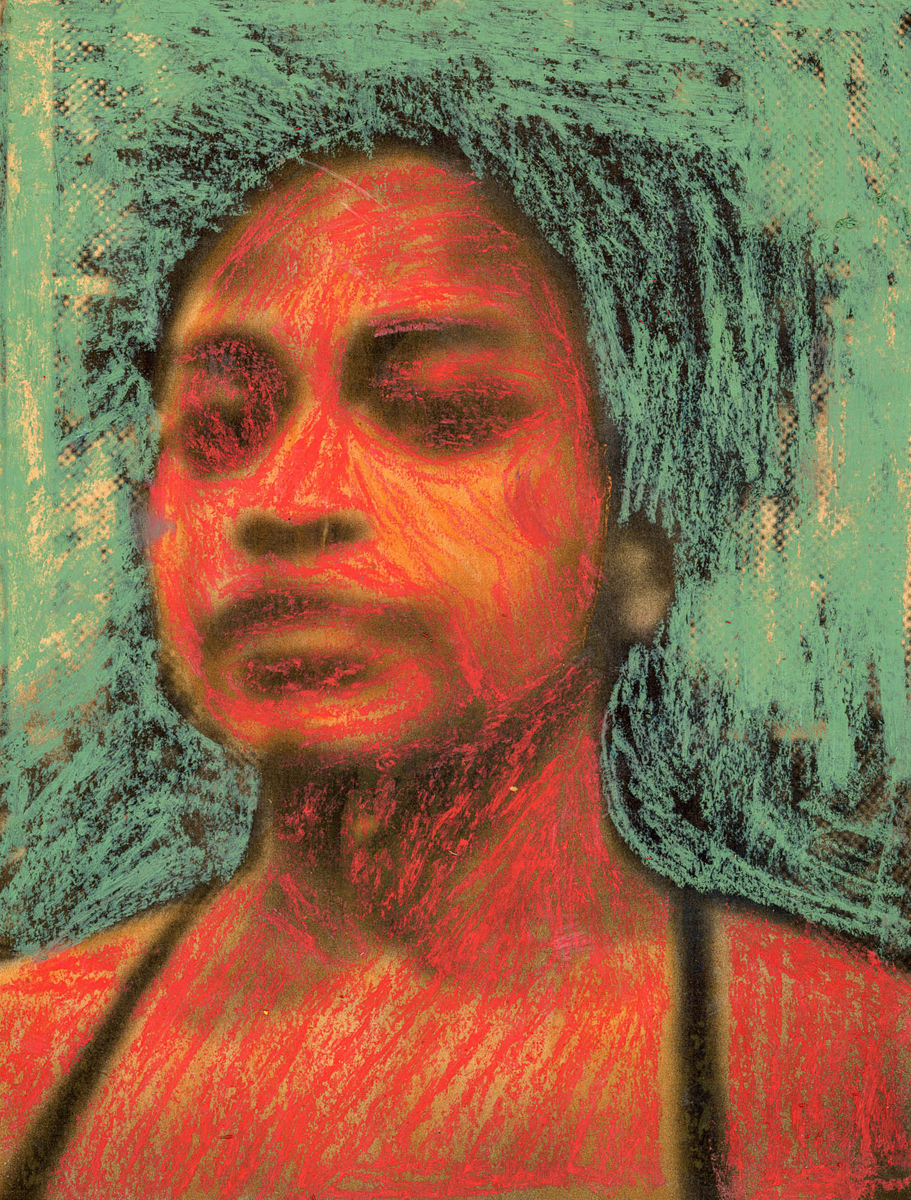 In “Portrait(s) Contact #24”, Marimutu conceals her portrait by coloring on top of it. The background is painted green while a contrasting orange hides her image. The hastened strokes of color hide her expression, making her unreadable to us, but also mysterious and compelling, suggesting myriad possibilities for identity and resolution.