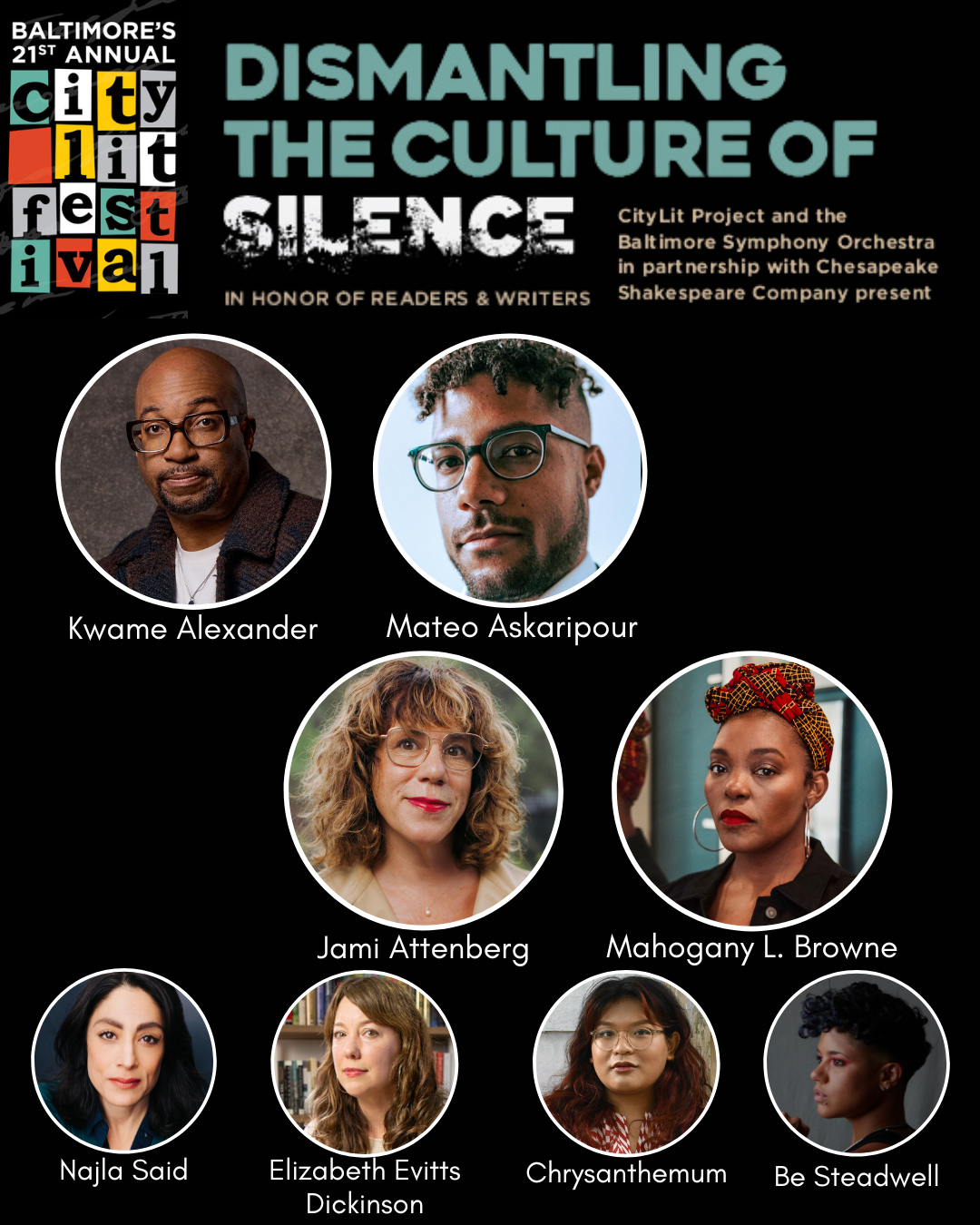 The three-day, 21st CityLit Festival is presented this spring in partnership with the Baltimore Symphony Orchestra (BSO) and Chesapeake Shakespeare Company (CSC). The annual signature event tackles the sobering theme Dismantling the Culture of Silence while featuring an extraordinary lineup of local, regional, and national talent, including poet Mahogany L. Browne (Chrome Sky) at the opening poetry event on Friday, April 12at CSC, and novelist Jami Attenberg (1000 Words) teaching a Master Class at Greedy Reads – Remington on Friday, April 19th. The daylong celebration onSaturday, April 20, 2024, returns to the Joseph Meyerhoff Symphony Hall on 1212 Cathedral Street from 9:30 am – 6:30 pm and highlights Emmy-Award-winning author Kwame Alexander (Why Fathers Cry at Night), the 2023 National Book Foundation’s 5 Under 35 honoree Mateo Askaripour (Black Buck),and new to Baltimore, R & B musical artist Be Steadwell.
