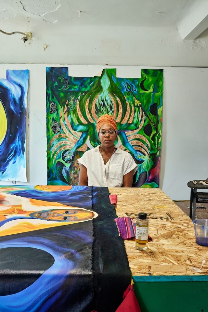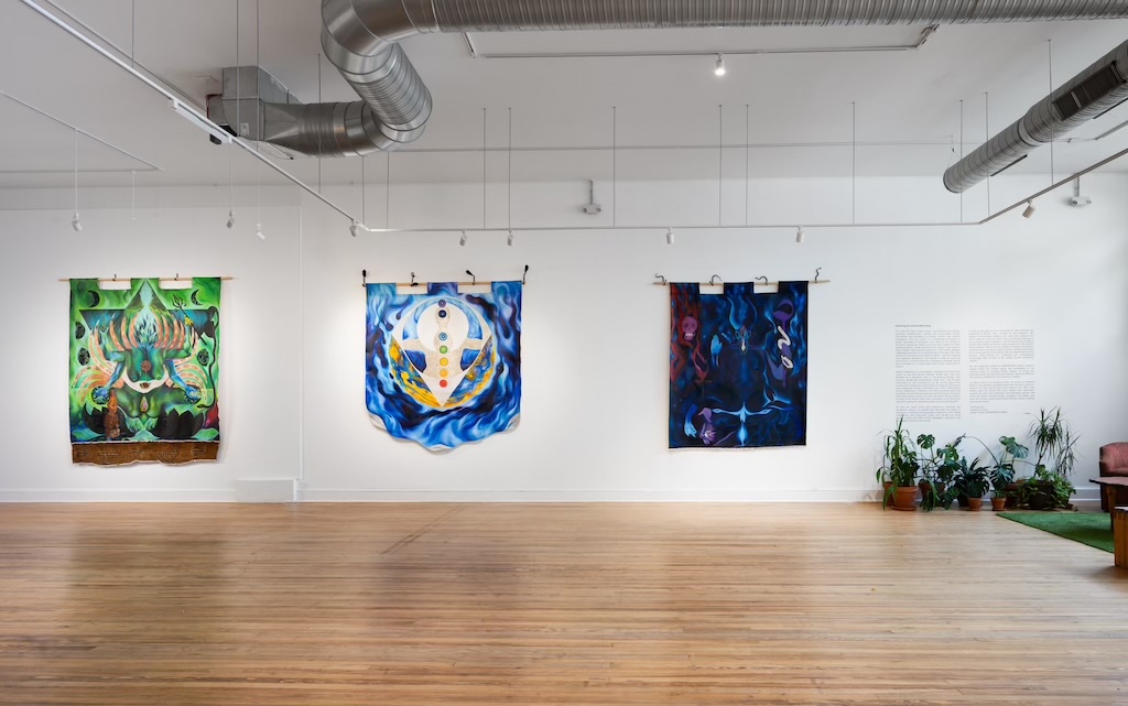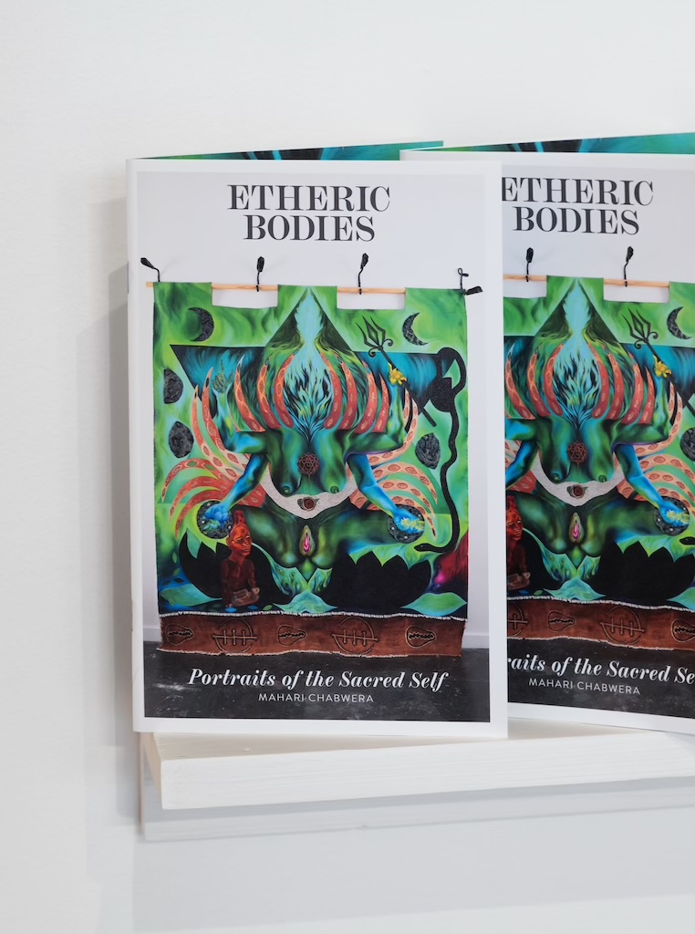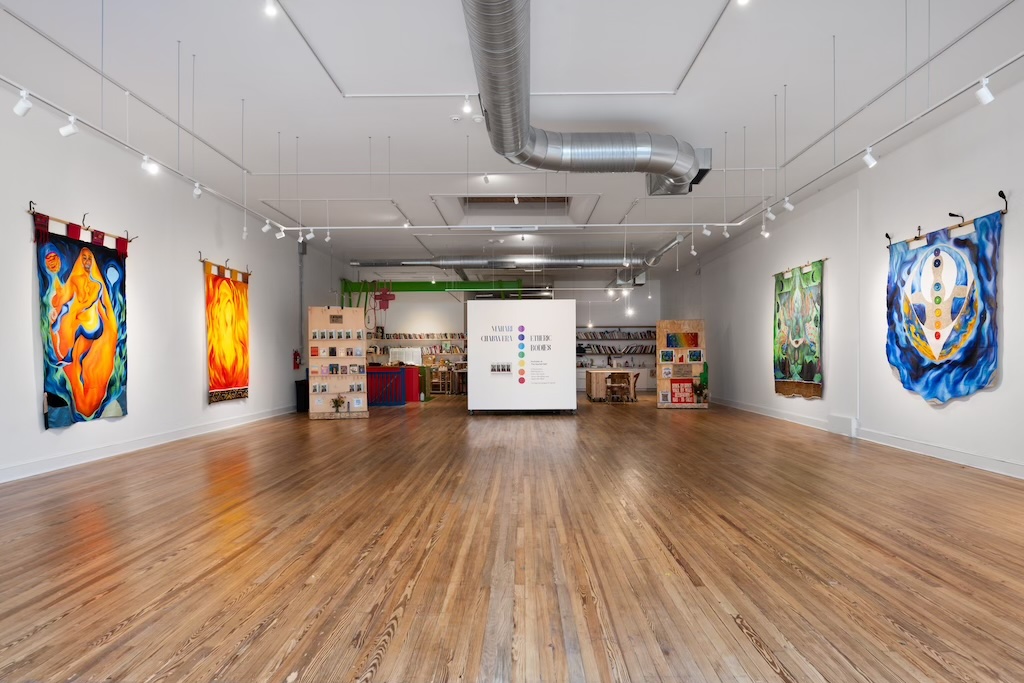 Movement and narrative were at the heart of Chabwera’s most recent solo exhibition, Etheric Bodies: Portraits of the Sacred Self, curated by Angela N. Carroll at NoMüNoMü gallery (which ended May 16th). In addition to six large-scale Tapestry paintings, themselves packed with visual dynamism, the show included workshops and events centered around moving the body. For the duration of the exhibition, NoMüNoMü became a venue for yoga sessions, communal concerts, dancing, and guided meditations.