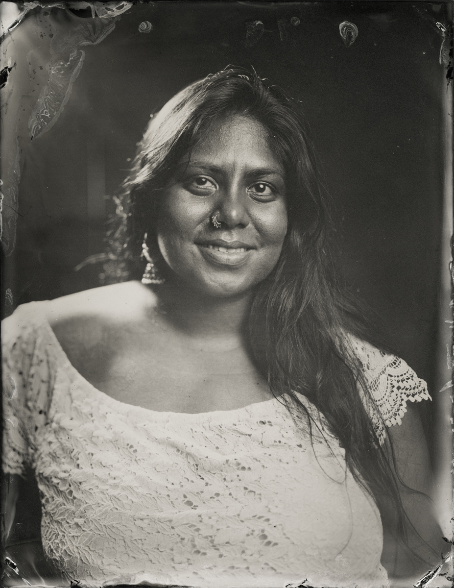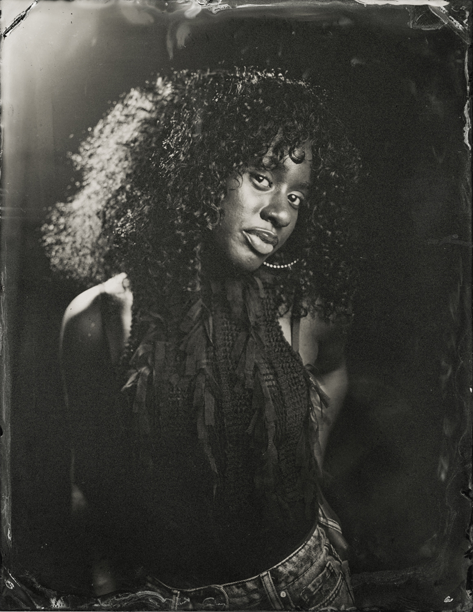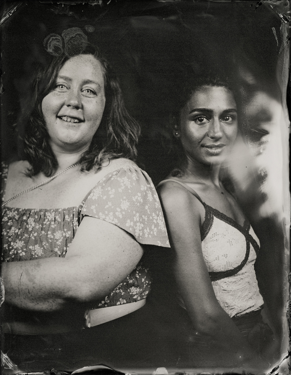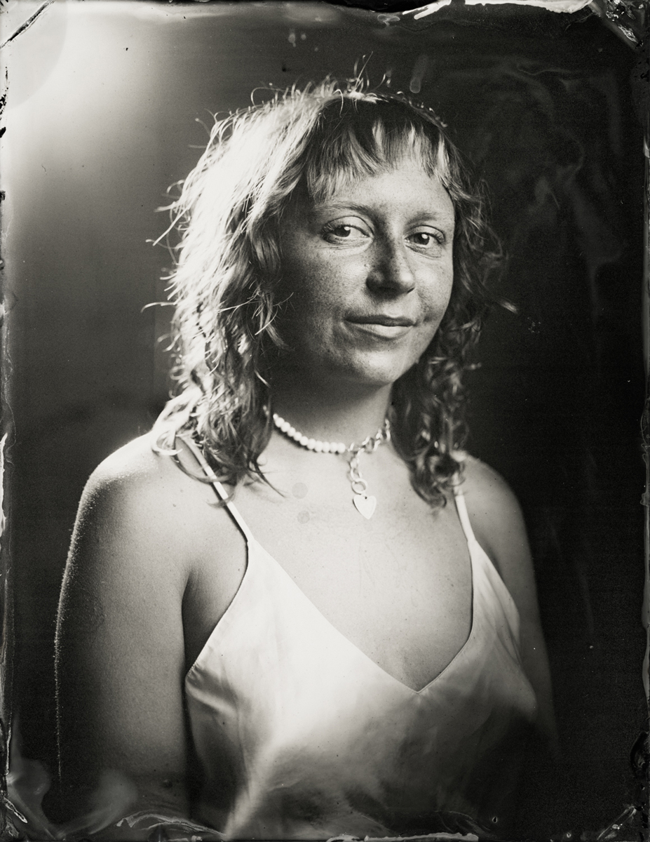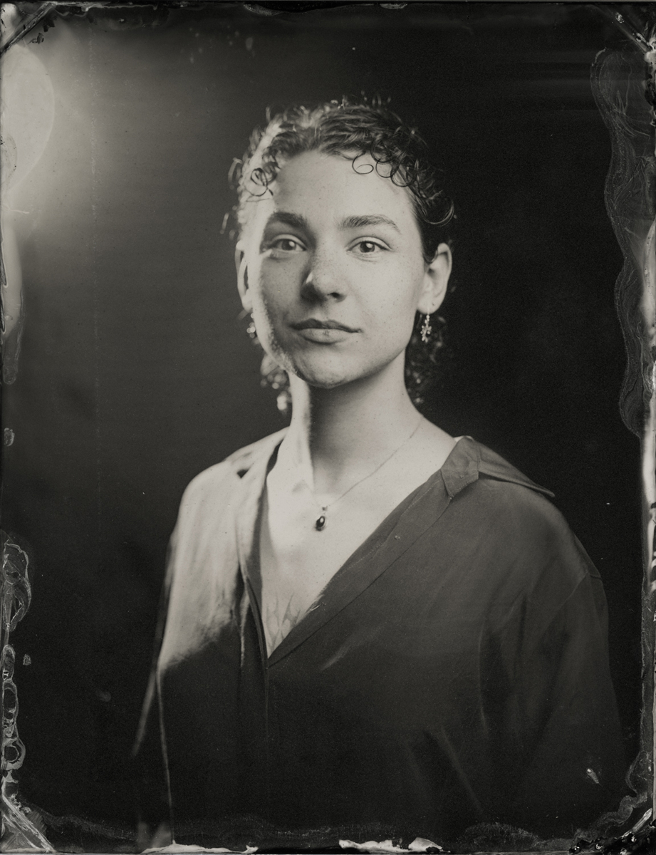 Elena Volkova: A tintype (or, wet plate collodion) is a photograph made by creating a direct positive on a thin sheet of metal coated with collodion and light-sensitive silver nitrate. During the sessions, each plate is hand-coated, exposed in camera, and developed instantly, with the process visible to the participants.